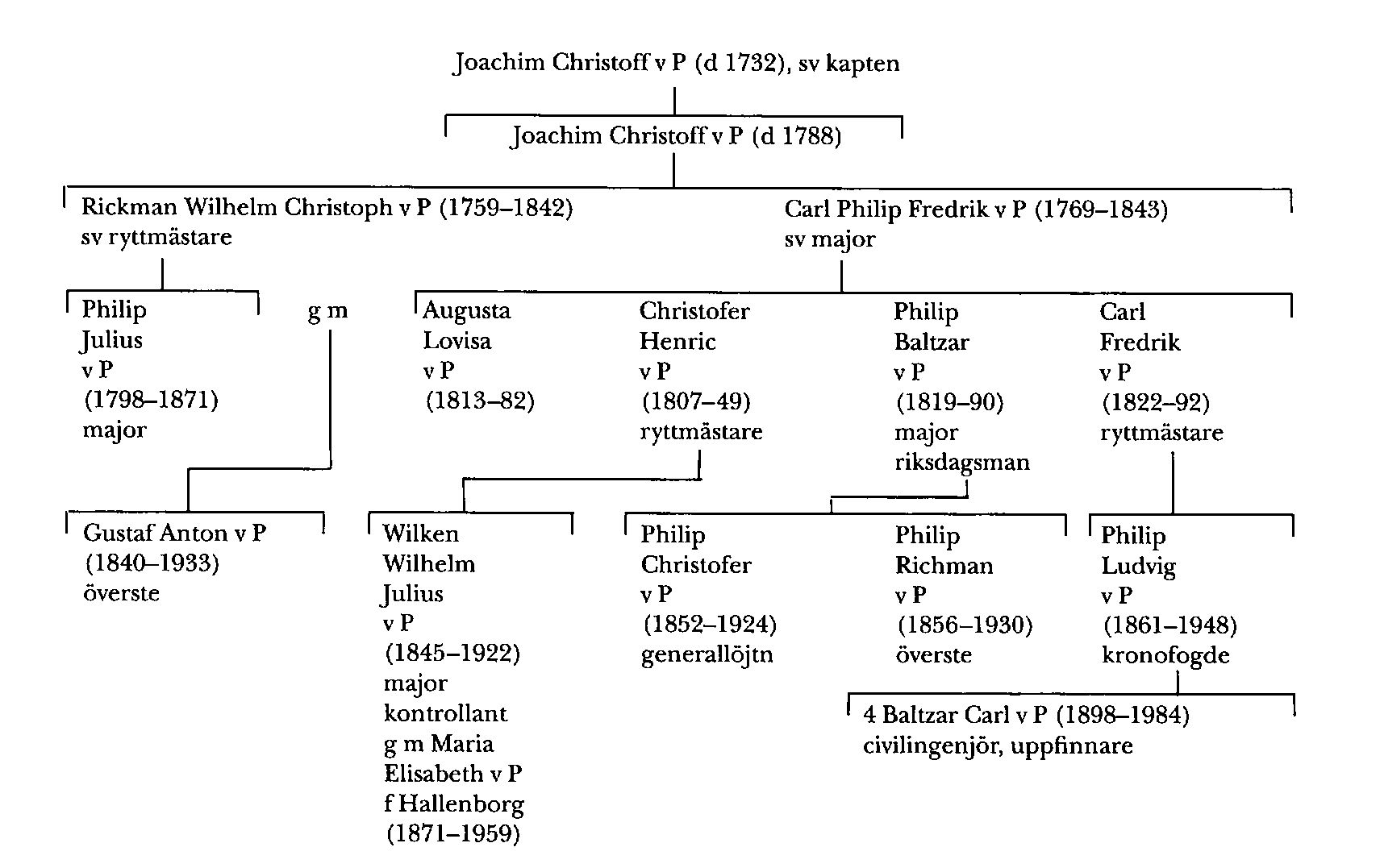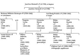 Christopher, Philip och Wilken v P:s kusin kronofogden i Ljunits, Herrestads och Vemmenhögs fögderi i Skåne Philip Ludvig v P (1861–1948) publicerade tillsammans med Gösta v P (se ovan) en bok om släkten v P och ensam – efter medförfattarens död – en omarbetad upplaga av de äldre partierna av denna bok (se nedan). Philip v P blev far till uppfinnaren civilingenjör Baltzar Carl v P (P 4).