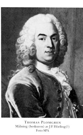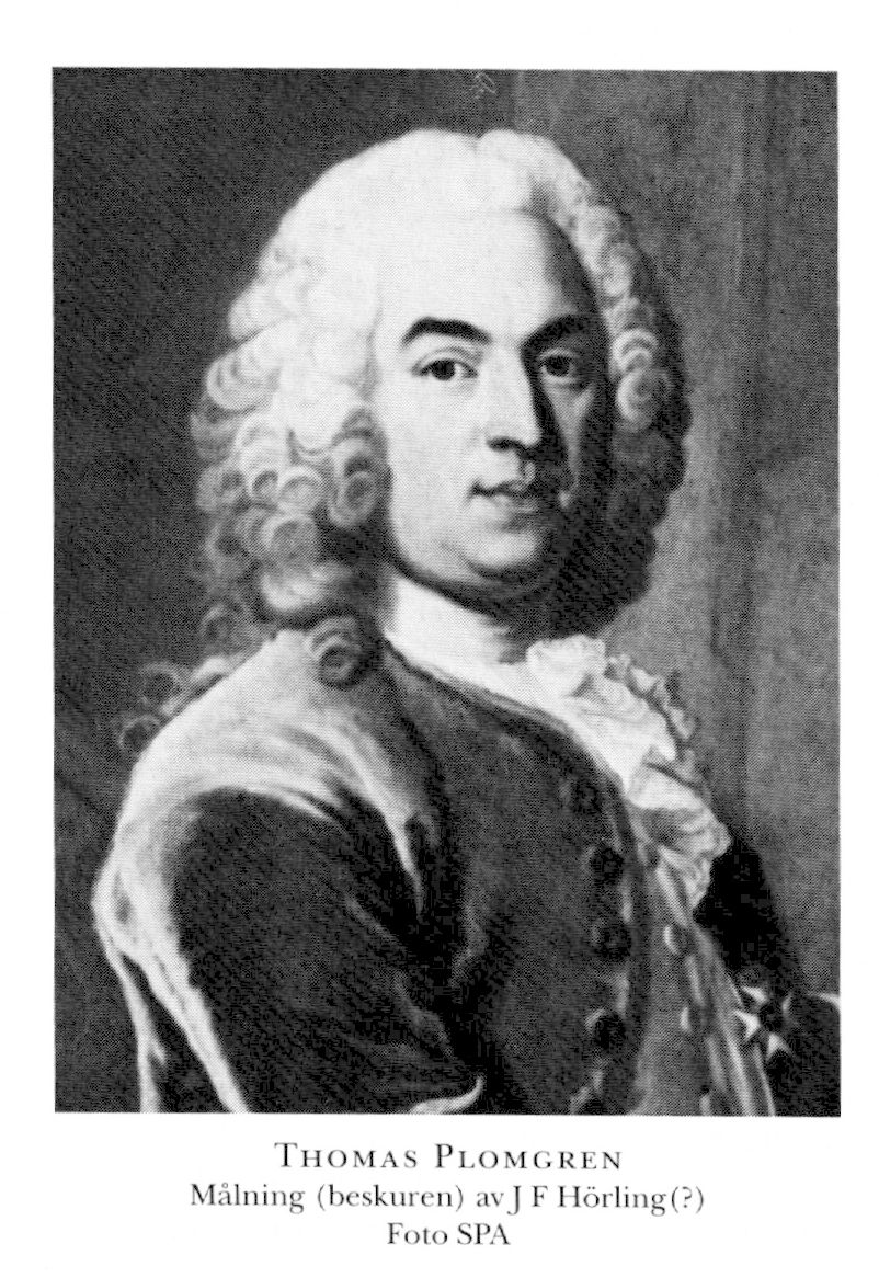 2 Plomgren, Thomas, bror till P 1, f 16 aug (Carleson), dp 19 aug 1702 i Sthlm, Kat, d 21 juni 1754 där, ibid. Anställd vid A G Trummers handelshus i Königsberg 19, burskap som handlande i Sthlm 4 nov 25, en av borgerskapets äldste 27, direktör o delägare i firma Anders & Thomas Plomgren 30, led av borgerskapets bemedlings-, tolags- o inkvarteringskomm 34, allt i Sthlm, stiftare av o direktör i Levantiska kompaniet 38 (k priv 20 febr), deltog i riksdagarna 38–52 (led av bl a kammar-, ekonomi- o kommersdeput 38, av bankodeput 38–39 o 51–52, av SU från 38, av sekreta handels- o manufakturdeput 39, borgarståndets talman 51–52), en av stiftarna av o direktör i Sjöassuranskompaniet 39 (k priv 4 juli), fullm i Generaltullarrendesoc 39, bankofullm från 19 april 39, led av 1741 års utredn:kommission 16 mars 41, rådman i Sthlm jan 42 (avsade sig uppdraget), fullm i riksens ständers kontor 43–47, huvudparticipant i Ostindiska kompaniet från 46 (k priv 7 juni), led av första växelkontoret från 47, assessor i Kommerskoll 26 mars 47 (Inr civ:exp), kommerseråd 24 april 47, handelsborgmästare i Sthlm 11 juni 47, led av brännvinskommissionen 17 nov 47, fullm i Jernkontoret från 48, led av ekonomikommissionen 49, stiftare av o led av direktionen för Saltkontoret 50 (k tillstånd att inrätta ett kontor 12 juni). – LVA 39.
