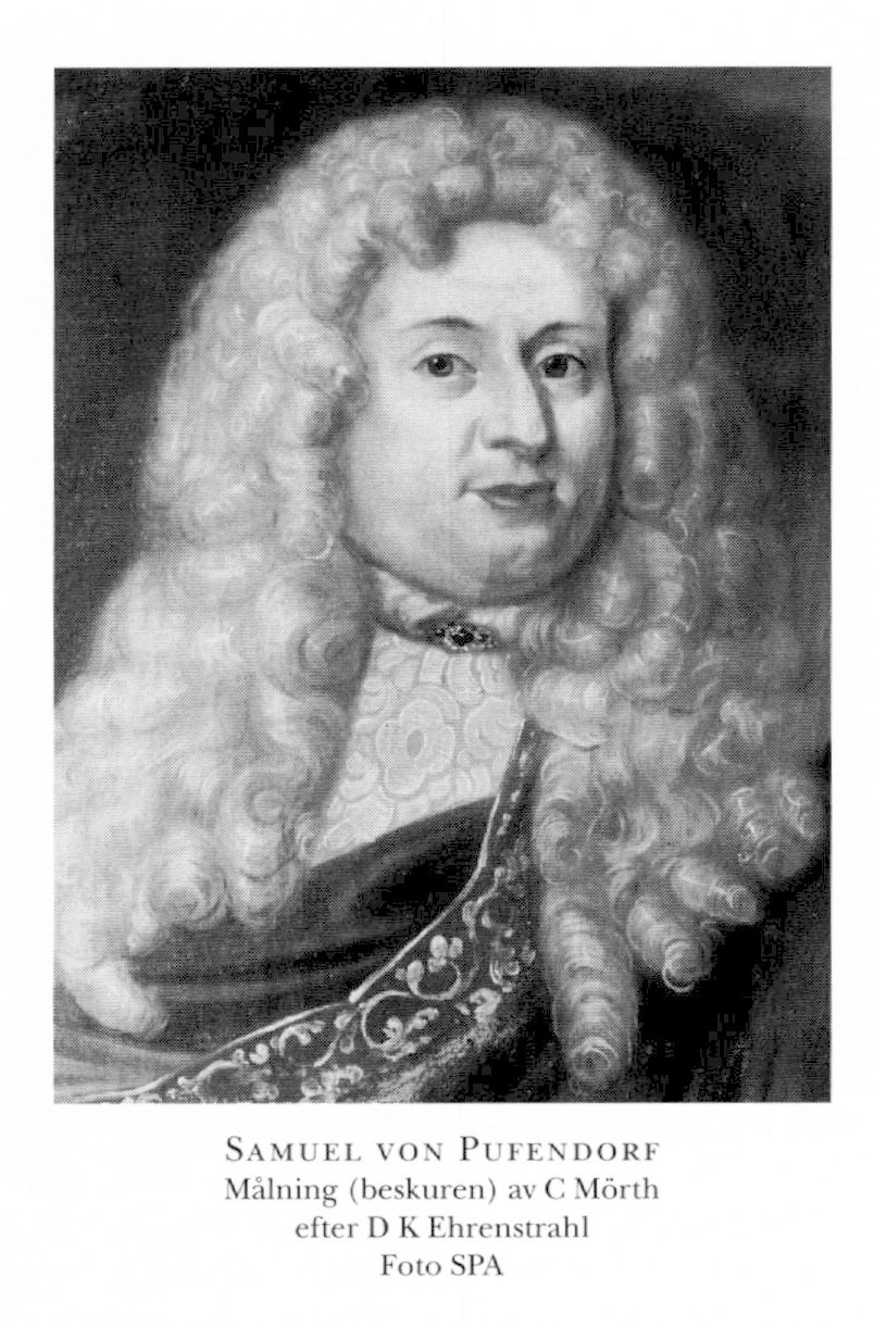 von Pufendorf, Samuel, f 8 jan 1632 i Dorfchemnitz, Sachsen, d 26 okt 1694 i Berlin (Biographica, Spenern). Föräldrar: kh Esaias Pufendorfer o Margaretha Hickmann. Skolgång i Grimma, Sachsen, inskr vid univ i Leipzig 50, vid univ i Jena 14 aug 56, mag där 19 aug 56, huslärare hos sv kommissarien i Khvn J P Coyet (bd 9) april 58, studier vid univ i Leiden 59, prof i folkrätt o filologi vid univ i Heidelberg 9 nov 61–68, lärare åt prins Karl av Pfalz 64–68, prof i natur- o folkrätt samt etik o statsfilosofi vid LU 29 nov 67 (tilltr aug 68), ordf i o led av kommissorialrätter i Skåne mars–okt 76, rikshistoriograf 24 aug 77–23 maj 94 (tjänstl från jan 88), k sekr 14 nov 77, häradsh i Askers hd, Ör, 15 maj 78–18 dec 80, assessor i Antikvitetskoll 24 jan 82, sekr hos drottn Ulrika Eleonora 82, adl 7 maj 84 (ej introd), brandenburgsk historiograf från sommaren 86 (tilltr febr 88), hovråd 88, led av Kammergericht i Berlin, geheimeråd 90, sv frih 31 maj 94 (ej introd).