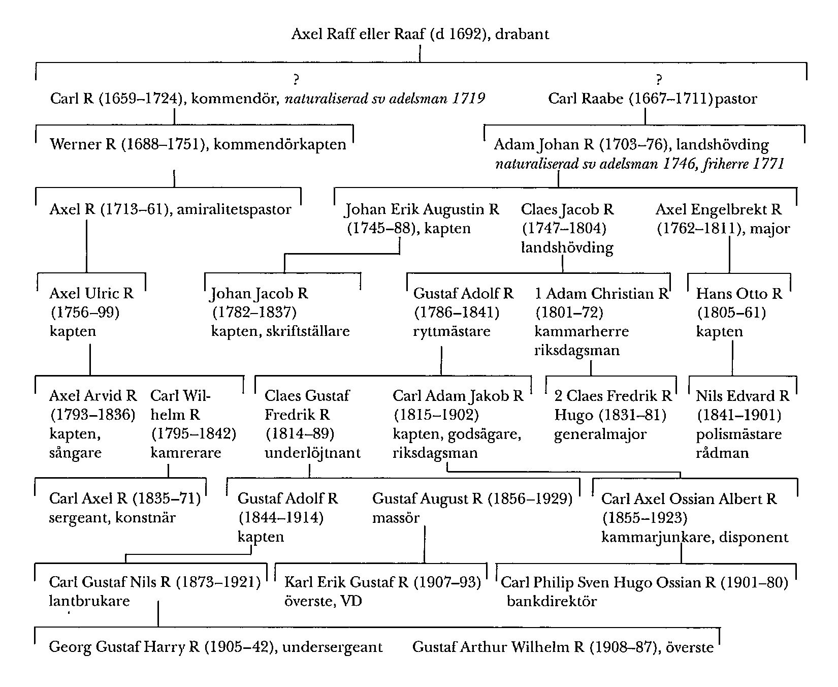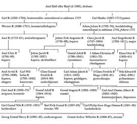 Som sonsons son till Reinhold R uppges Carl R (1659–1724). Ättartavleuppgiften att dennes far skulle ha begravts i Sthlm 1692 gäller emellertid en drabant Axel "Raff" eller "Raaf"'. Carl R deltog bl a i sjöslagen i Köge bugt 1677 och 1710 och flottoperationen i Öresund 1700. Mest känd har han blivit genom att han 1713 tillfogade en flerdubbelt starkare rysk eskader stora förluster vid Högland. R befordrades till holmmajor 1712, fick kommendörs avsked 1717 och naturaliserades 1719 som sv adelsman, då han uppgav sig vara av tyskt adligt ursprung.