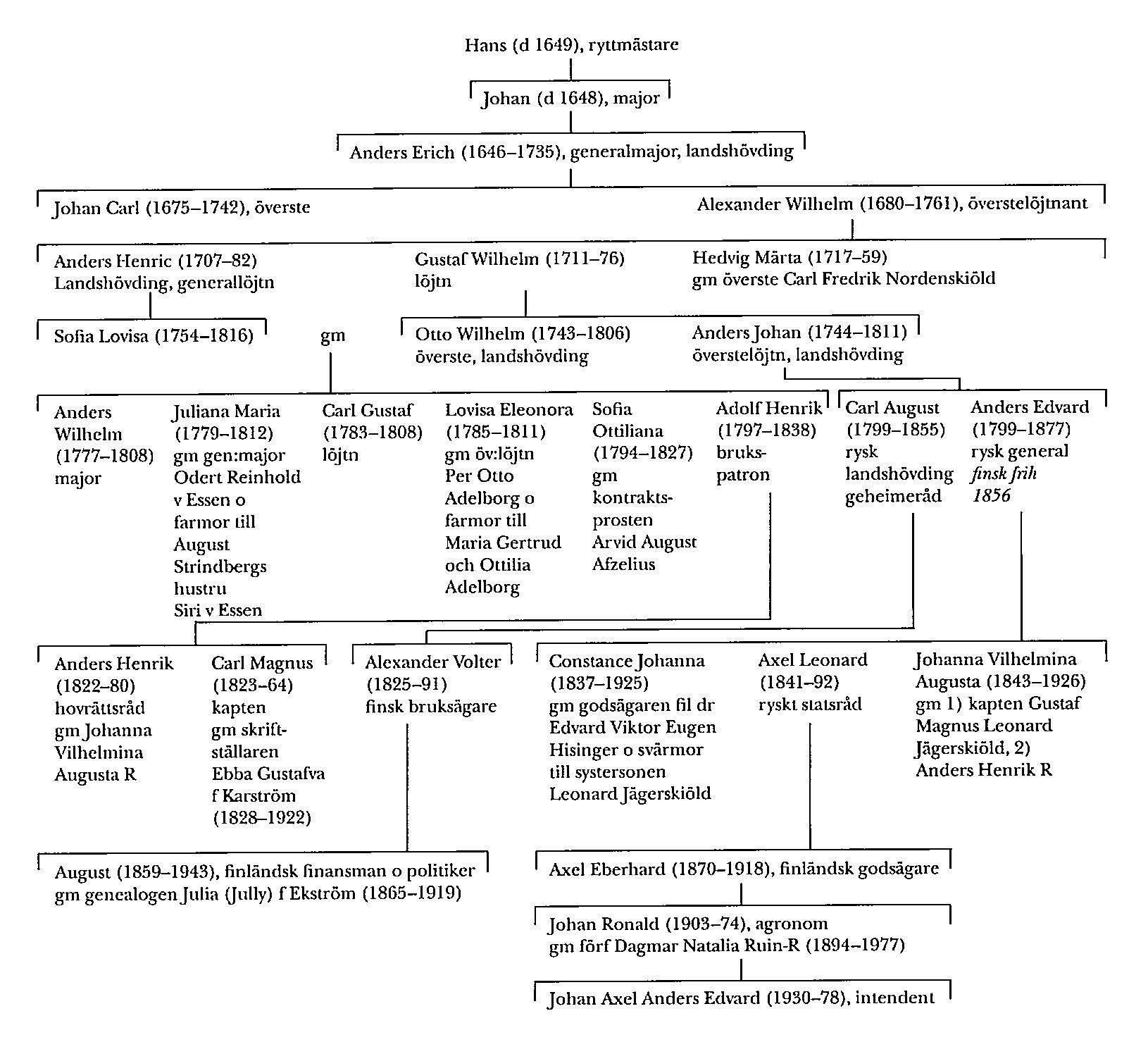 Hans R:s sonson Anders Eric R (1646–1735) deltog i slagen vid Halmstad och Lund 1676 samt slaget vid Landskrona 1677 och blev överste för Nylands fördubblingskavalleriregemente 1700 och för Nylands och Tavastehus läns kavalleriregemente 1709. Anders R utmärkte sig under försvaret av Finland och Ingermanland mot ryssarna och befordrades 1713 till generalmajor och landshövding i Västerbotten. 1717 (jfr bd 9, s 156) suspenderades och arresterades han för att ej ha utnyttjat alla resurser till motstånd vid ryssarnas anfall mot Umeå 1714. En kommission tillsattes, som avgav fällande dom 1718. Efter Karl XII:s död frigavs R 1719. Genom sitt äktenskap hade han kommit i besittning av säteriet Jackarby i Borgå sn.