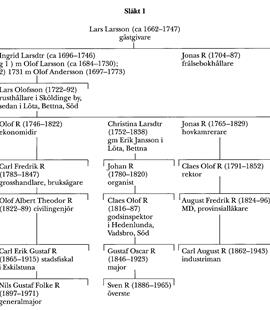 1 Gästgivaren Lars Larsson (ca 1662–1747) i Ramsta var far till frälsebokhållaren och innehavaren av Ramsta kronorusthåll Jonas R (1704–87), vars syster Ingrid Larsdtr (ca 1696–1746) var gift först med Olof Larsson i Ramsta (ca 1684–1730) och sedan med Olof Andersson (1697–1773), skattebonde, rusthållare o nämndeman i Ramsta. Olof Andersson blev i ett senare äktenskap far till vice häradshövdingen Johan R (se nedan, släkt 2).
