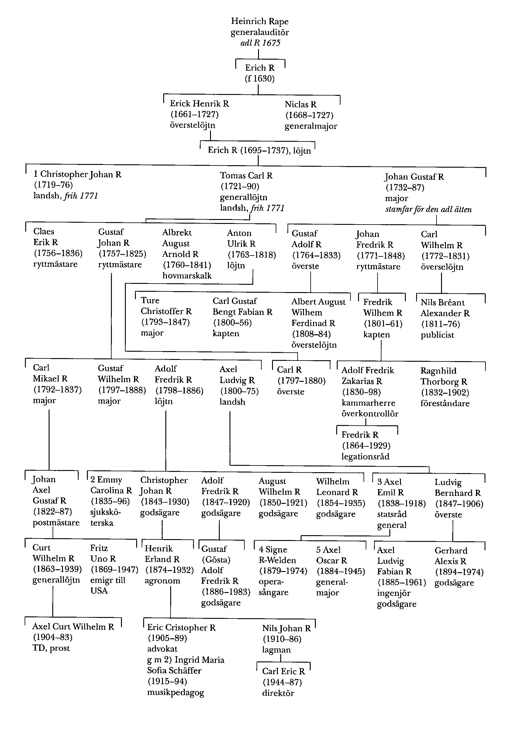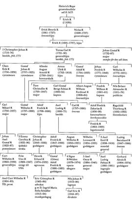 Av sonen löjtnanten vid Kronobergs regemente Erich R:s (1695–1737) i Dädesjö, Kron, söner blev två landshövdingar, Christopher Johan R (R 1) och Tomas Carl R (1721–90, se nedan). Väl sedda av Gustav III blev de friherrar 1771 och introducerades på Riddarhuset 1776. En tredje son, majoren vid Smålands kavalleriregemente Johan Gustaf R (1732–87), blev stamfar för den adliga ätten R. Han bevistade riksdagarna under perioden 1751/52–1778/79.