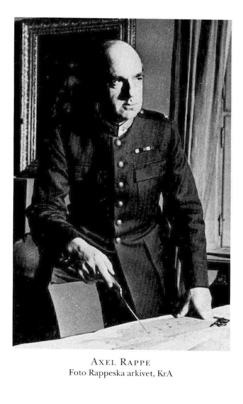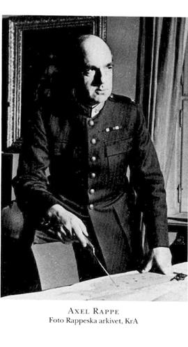 5 Rappe, Axel Oscar, son till R 3, f 22 juni 1884 i Bo, Sth, d 31 okt 1945 i Karlstad. Mogenhetsex vid H reallärov å Norrmalm, Sthlm, 16 maj 02, volontär vid Första Svea artillerireg 9 juni 02, officersex 28 nov 04, underlöjtn vid Svea artillerireg 8 dec 04, elev vid Artilleri- o ingenjörhögskolan 06–07, löjtn av 2 kl vid reg 31 aug 07, elev vid Krigshögskolan 08–10, aspirant vid Generalstaben 1 maj 11–30 april 13, löjtn av 1 kl vid reg 9 juni 11, bitr lär i krigskonst vid Artilleri- o ingenjörhögskolan 14–18, kapten av 2 kl vid reg 30 dec 16–12 febr 18, i krigstjänst i Finland 13 febr–31 juli 18 (major vid Gustaf Mannerheims generalstab 22 febr, överstelöjtn 12 april, stabschef i Östarméns stab 12 april–31 juli), åter kapten av 2 kl vid Svea artillerireg 29 okt 18, kapten av 1 kl vid reg 11 april 19, lär i krigskonst vid Artilleri- o ingenjörhögskolans högre kurser 22–29, sektionschef vid Generalstabens krigshist avd 10 nov 24–15 nov 27, stabsadjutant o kapten vid Generalstaben 6 maj 27, major där 1 jan 28, stabschef vid Militärbefälet för övre Norrland 1 jan 28–26 sept 30, vid Östra arméfördeln:s stab 4 okt 30–4 okt 31, militär sakk i 1930 års försvarskommission 10 sept 31–30 aug 35, chef för Generalstabens centralavd 9 okt 31–1 nov 35, överstelöjtn i Generalstaben 18 dec 31, vid Generalstaben 7 okt 32, överste i Generalstaben 23 juni 35, överste o chef för Göta artillerireg 31 jan (tilltr 1 okt) 36, chef för Svea artillerireg 21 jan (tilltr 1 okt) 38, generalmajor i armén 3 nov 38, i generalitetet 20 jan 39, till chefens för Försvarsstaben förfogande 1 febr 39, ställföretr chef för Försvarsstaben 15 dec 39–31 mars 41, led av militära förvaltn:utredn nov 40–febr 41, inspektör för artilleriet 10 jan (tilltr 1 april) 41, militärbefälhavare i Femte militärområdet 30 juni (tilltr 1 okt) 42, i Fjärde militärområdet o tillika överkommendant för Sthlms garnison 1 april 44 (utn återkallad). – LKrVA 32.