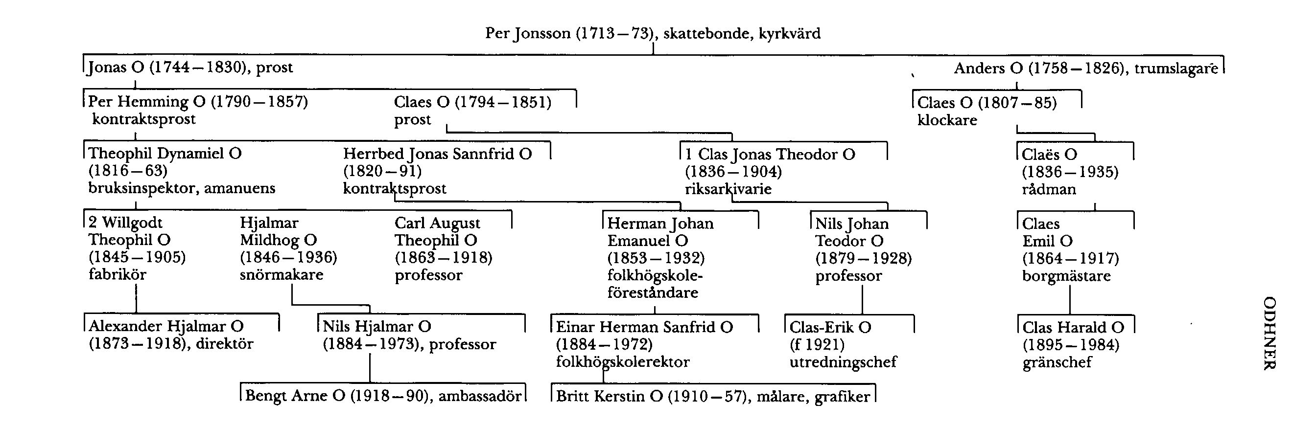 Anders O:s äldre bror prosten Jonas O (1744–1830) i Lyrestad, Skar, var i äktenskap med en dotterdotterdotter till statsrådet greve Thomas Polus far till prosten magister Claes O (1794–1851) i Medelplana, Skar, som i äktenskap med en syster till järnvägschefen Nils Ericson och uppfinnaren John Ericsson (båda bd 14) blev morfar till hembygdsentusiasten rådman Karl Trotzig och far till riksarkivarien Clas Jonas Theodor O (O 1). I äktenskap med en dotter till domprosten professor Anders Erik Knös (bd 21, s 400) var denne far till Nils Johan Teodor O (1879–1928). Teodor O deltog i Gustaf Kolthoffs (bd 21) expedition till Spetsbergen och nordöstra Grönland 1900 och Leonard Jägerskiölds (bd 20) till Egypten, Sudan och Sinai 1900–1901. Han blev fil dr på avhandlingen Die Trematoden des arktischen Gebietes (1905), docent i zoologi i Uppsala så, professor i samma ämne vid universitetet i Kristiania 1914 och intendent för Naturhistoriska riksmuseets evertebrat-avdelning 1918, varjämte han 1922–26 var föreståndare för Sthlms arbetareinstitut, från 1923 v sekreterare i VA, där han blev ledamot 1925, 1924–26 ordförande i Samfundet Sverige-Finland, från 1924 ledamot av granskningsnämnden för NF:s tredje upplaga och från 1926 ledamot av styrelsen för StH. O:s vetenskapliga produktion omfattar 47 arbeten om tillsammans c:a 700 sidor, varav 41 arbeten om inälvsmaskar och tre om kräftdjur. I äktenskap med en dotter till ögonläkaren Erik Nordenson (bd 27, s 303) var han far till fd chefen för LO:s utredningsavdelning agr lic Clas-Erik O (f 1921).