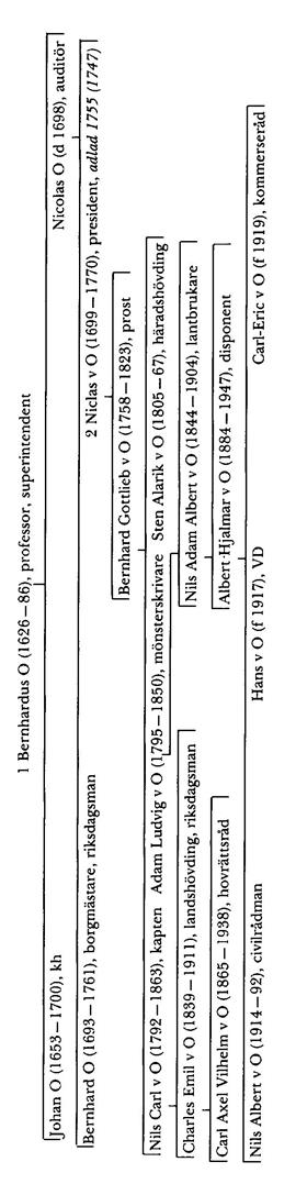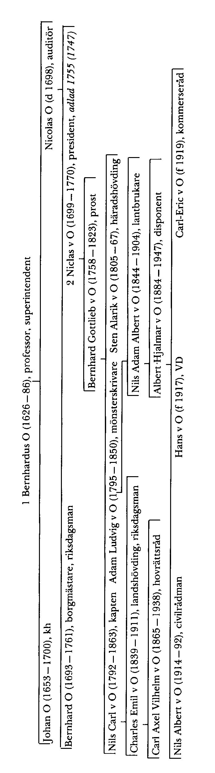 Hans son prosten Bernhard Gottlieb v O (1758–1823) i Gillberga, Söd, var far till häradshövdingen i Västerbottens mellersta domsaga Sten Alarik v O (1805-67). Brorson till denne var Charles (i fdb Carl) Emil v O (1839–1911). Charles O förvaltade 1876–92 sin mormödernesläkts fd gods Julita i Julita, Söd, blev 1894 överste för Dalregementet och var 1894–97 tf landshövding i Kopparbergs län, 1898–1909 landshövding i Kronobergs län samt 1902–10 riksdagsman i FK. Han var far till Carl Axel Vilhelm v O (1865–1938). Axel v O var 1909–35 hovrättsråd i Svea hovrätt.