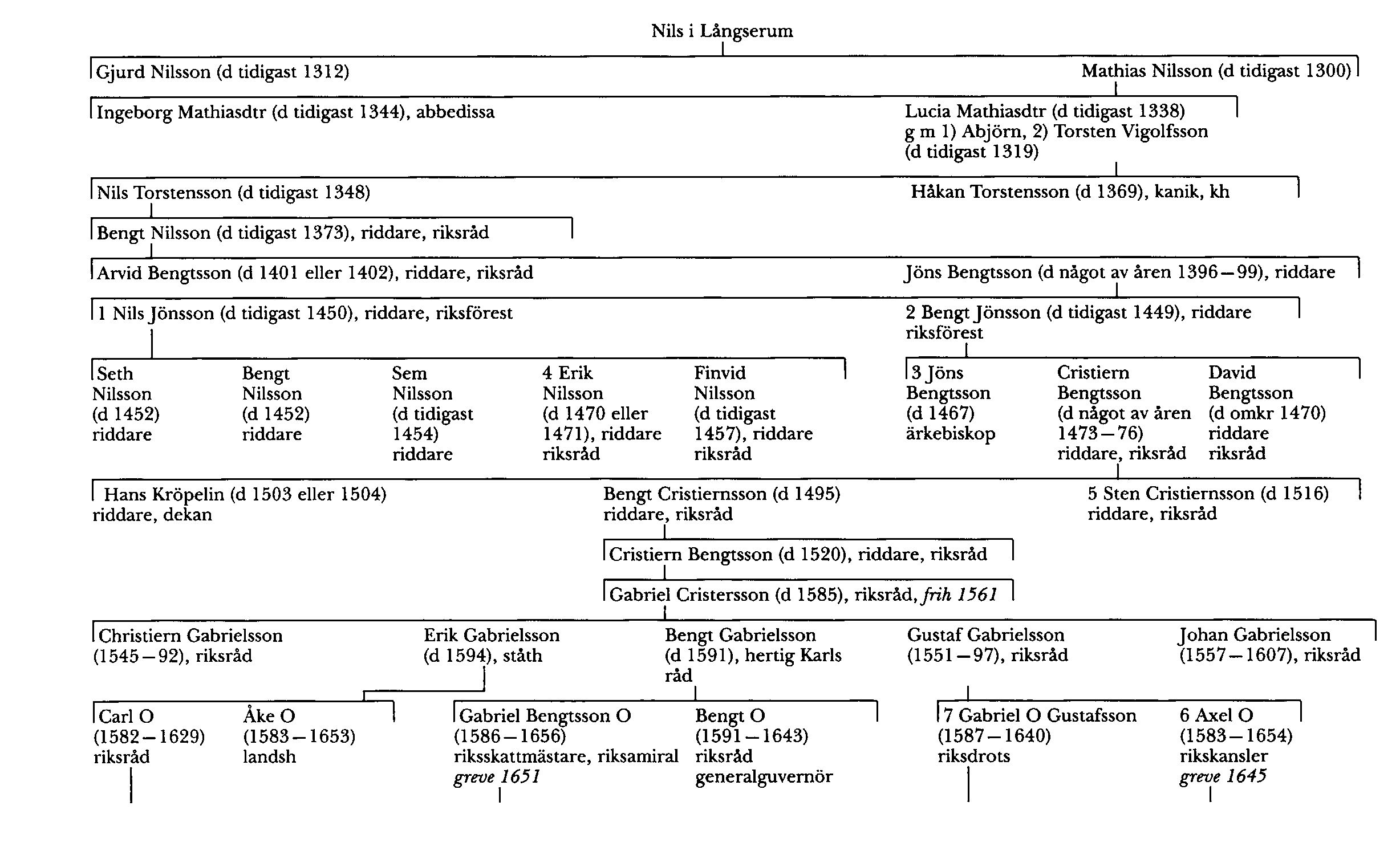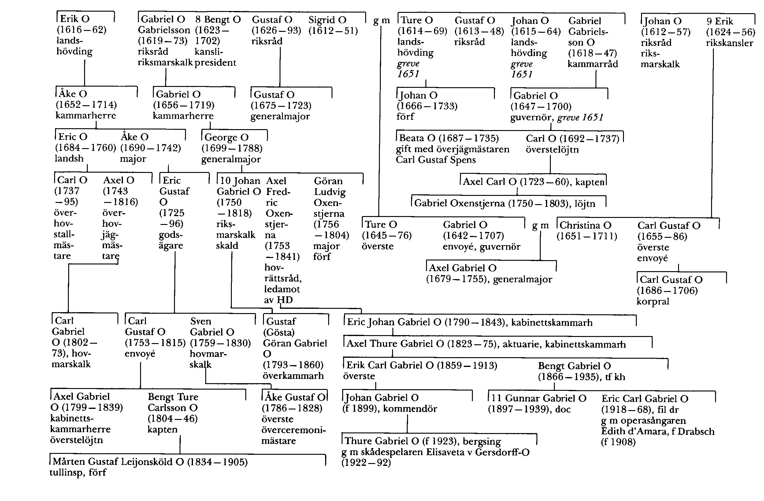 I äktenskap med en dotter till riksrådet och lagmannen Axel Eriksson (Bielke; bd 4), alltså en faster till Johan III:s andra gemål, blev G svärfar till riksråden Åke Axelsson (Natt och Dag; bd 26), Carl Bonde (bd 5), Jöns Kurck (bd 21), och Johan Sparre och far till rikskanslern Axel O (O 6). Denne blev greve 1645 och stamfar för den släktgren som på Riddarhuset efter hans grevskap kom att kallas O af Södermöre. Han var svärfar till riksmarsken Gustav Horn (bd 19) och far till Johan O A:son (1612–57). Denne inskrevs vid UU redan 1621 och vid universitetet i Leiden 1631 samt blev magister i Oxford 1633 i samband med att fadern sänt honom till England för att officiellt underrätta om Gustav II Adolfs död. Likpredikningarnas uppgift, att han en tid skulle ha varit överste för det redan 1631 upphörda s k Röda infanteriregementet, torde enligt KrA:s handlingar vara oriktig. 1634 var O ånyo på beskickning till England och även till Holland, och 1635 var han en av de fem sv kommissarier som i Stuhmsdorf i Ostpreussen slöt stillestånd med Polen (jfr bd 5, s 688 o 690, 23, s 148, o 26, s 444). Han blev kammarråd 1637 och riksråd och kansliråd 1640 samt det ena av Sveriges ombud vid westfaliska fredskongressen 1641. Först 1643 begav sig emellertid O till Westfalen efter att sedan 1641 ha ägnat sig åt reorganiseringen av förvaltningen av Pommern och förhandlingar med kurfursten av Brandenburg. Vid fredskongressen hävdade han i enlighet med faderns anvisningar med skärpa de sv kraven, men han hade på grund av bristande smidighet svårt att komma överens med sin lågbördige men mer begåvade och erfarne kollega Johan Adler Salvius (bd 1), som vid flera tillfällen bakom hans rygg för motparten avslöjade Sveriges yttersta villkor men stöddes av drottning Kristina. O omtalas därjämte ej sällan som upphetsad av starka drycker (Odhner 1876, s 144), så att det var svårt att förhandla med honom om eftermiddagarna (Dickmann, s 197). Efter fredsslutet 1648 blev han en av de tre ledamöterna av den kommission som skulle ordna förhållandena i Pommern (jfr bd 23, s 148 f) och han deltog också i förhandlingarna om gränsen mot den del av Pommern som tillfallit Brandenburg. Först 1651 återkom O till Sverige, där fadern 1652 överlät sitt finländska friherreskap Kimito till honom. Han blev lagman i Uppland 1653 och riksmarskalk 1654. Sistnämnda år blev O också den förste kanslern för Greifswalds universitet, och 1655 blev han president i Wismarska tribunalet och – som kompensation för att hans yngre bror blivit faderns efterträdare som rikskansler (Wittrock 1917) – Sveriges befullmäktigade legat i Tyskland. Genom sitt första äktenskap – med den sista medlemmen av grevliga ätten Sture – hade han kommit i besittning av bl a Hörningsholm på Mörkö och Tullgarn i Hölö, båda i Södermanland, vilka efter hennes död utan barn 1646 ärvdes av hennes mor, som testamenterade godsen till O; en av moderns släktingar väckt arvsprocess var ännu vid hans död ej avgjord. O gifte 1648 om sig med sin ungdomskärlek Margareta Brahe (bd 5), som var änka efter hans fars kusin Bengt O (se nedan) och syster till riksdrotsen Per Brahe d y (bd 5), men hon var, f 1603, för gammal för att kunna få barn. Vid sin död var han landets störste godsägare (Asker). O:s grav finns liksom faderns och farfaderns i Jäders kyrka i Södermanland.