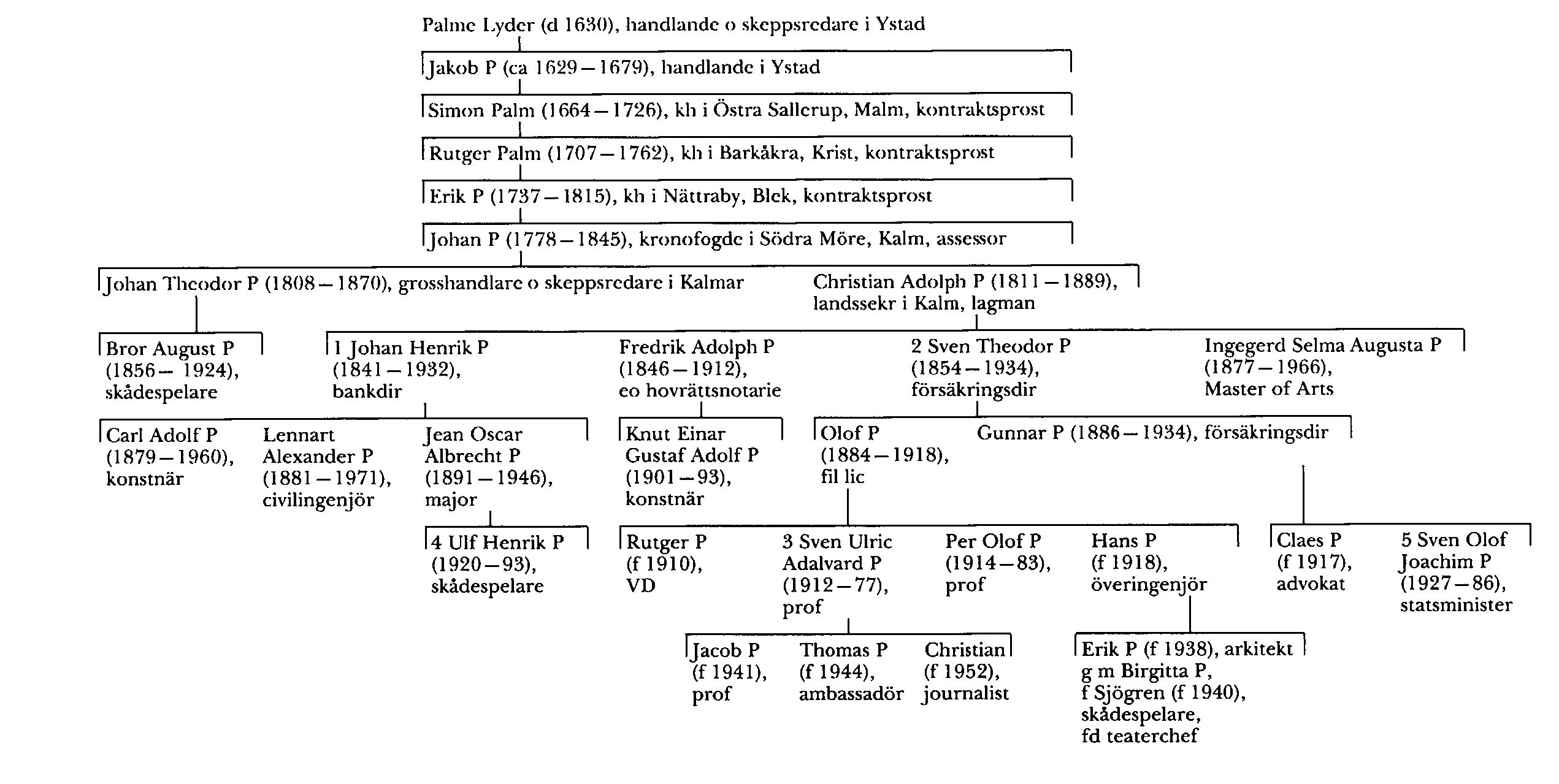 Palme, släkt, härstammande från skepparen och handelsmannen i Ystad Palme Lyder (d 1630), vilken senast 1607 inflyttade till nämnda stad från en ort inom lågtyska språkområdet, sannolikt Holland. Hans söner antog namnet P, bland dem Jacob P (ca 1629–79), handelsman i Ystad och föreståndare för stadens latinskola. Dennes söner ändrade släktnamnet till Palm (ännu levande släkt), men en sonsons son till honom (jfr släkttavlan), Erik (1737–1815), kh i Nättraby, Blek, och kontraktsprost, återtog liksom sina syskon släktnamnet P. Erik P var far till Johan P (1778–1845), kronofogde i Södra Möre hd, Kalm, med assessors n h o v, från vilken alla nu levande medlemmar av släkten härstammar.