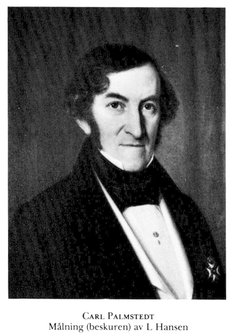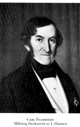 2 Palmstedt, Carl, son till P 1, f 9 juni 1785 i Sthlm, Ridd, d 6 april 1870 där, Ad Fredr. Inskr vid UU 31 juli 94, elev vid Tyska skolan i Sthlm, inskr vid univ i Greifswald 5 juni 01, kontorist vid Handelshuset G D Wilcke & Erdman i Sthlm 03—06, grundare av o delägare i Firma Martelleur & Co där 06—08, ägde Morstabergs säteri, Vårdinge, Sth, 08—15, deläg i Gripsholms kemisk-tekniska fabriker vid Mariefred 18, disponent där 20—25, disponent vid den från Gripsholm till Kummelnäs på Värm-dön, Sth, flyttade anläggn:en 25—28, förest för Chalmerska slöjdskolan i Gbg (invigd 5 nov 29) juni 28—vt 52 o lär där i tillämpad fysik samt mekanisk o kemisk teknologi, prof:s n h o v 2 sept 30, ordf i Frivilliga brandkåren i Gbg 30—52, sekr i Gbgs o Bohus läns hushålln:sällsk 33—47, ordf i Konst- o slöjdfören där 41, i Gbgs slöjdfören 46—52, sekr o föredragande led i bestyreisen för slöjdutställn:arna i Sthlm 47 o 51, konsulterande i Kommerskoll från jan 53, led av centralkomm för 1862 års industri- o konstutställn i London 61, för 1866 års allm industriutställn i Sthlm 65, deltog bl a i organiserandet av tekn skolor i Malmö, Eskilstuna o Norrköping. — LLA 22, LVVS 30, LVA 38, LMA 56.