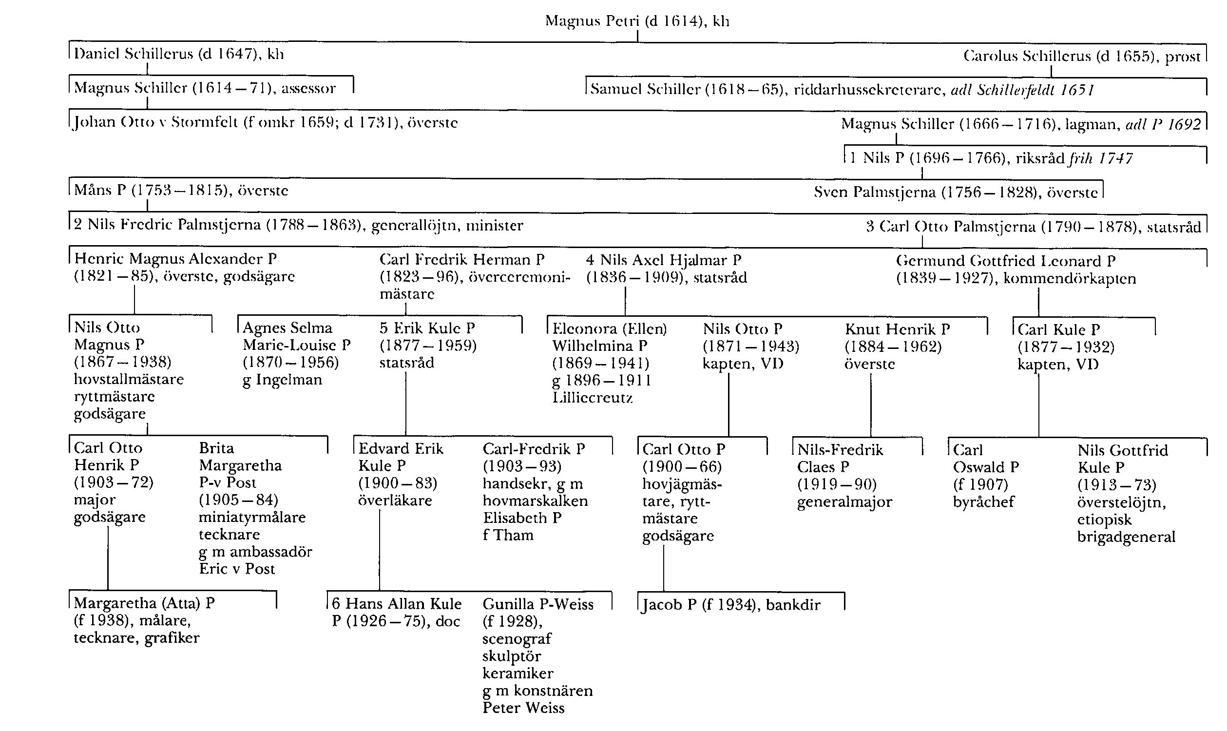Palmstierna (Palmstjerna), släkt, härstammande från kh Magnus Petri (d 1614; bd 24) i Stigtomta, Söd, vars fyra söner kallade sig Schillerus efter faderns boställe Skillra. Bland dem var Carolus Schillerus (d 1655), som studerade i Wittenberg från 1608, i Rostock från 1610 och i Uppsala från omkring 1614 samt blev kh i Åker, Söd, 1620, prost 1624 och kh i Flöda, Söd, 1636. Dennes son sekreteraren i Svea hovrätt Samuel Schiller (1618-65) adlades 1651 med namnet Schillerjeldt, blev s å assessor och var från 1660 riddarhussekreterare. Denna släktgren dog ut redan 1695 med hans söner.