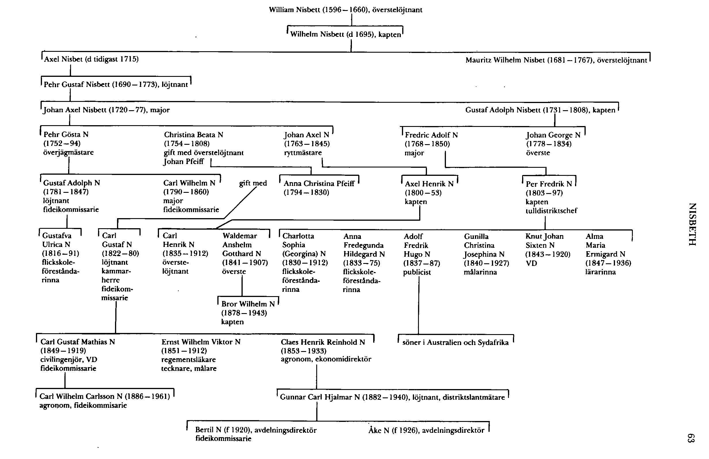 Hans son kapten Wilhelm Nisbett (d 1695) skall enligt missiv till Riddarhuset (Sköldebrevssaml) ha blivit naturaliserad 1664 och introducerades 1675. Han deltog i Karl XI:s skånska krig (Likv). Genom sina äktenskap kom Nisbett i besittning av flera gårdar i såväl Uppland som Östergötland, av vilka han bebodde Sundby i Funbo, Upps. Han drabbades emellertid av Karl XI :s reduktion, och redan dessförinnan hade han måst sälja eller pantsätta de flesta av gårdarna.