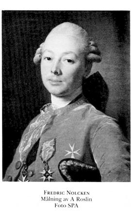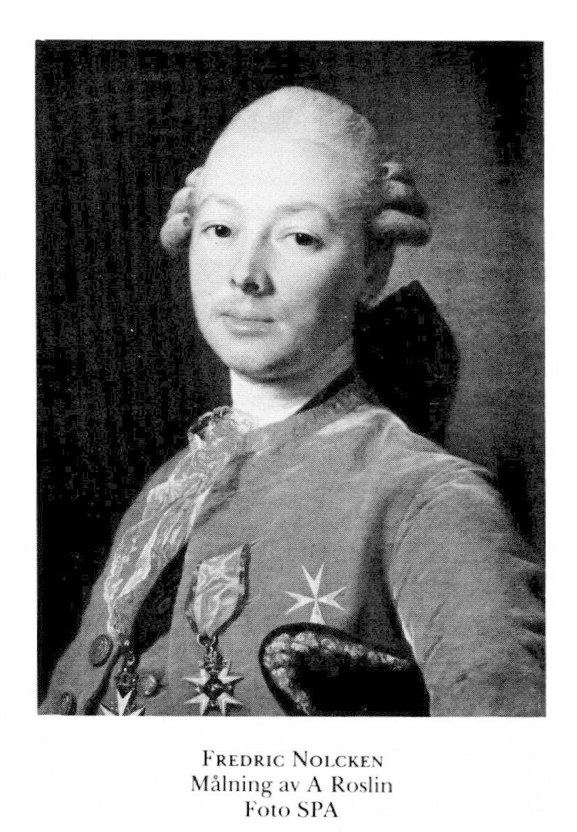 3 Nolcken, Johan Fredric, bror till N 2, f 30 dec 1737 i Stralsund, S:t Nikolai, d 22 febr 1809 i Sthlm, Jak o Joh. Volontär vid livg 1 juni 51, sergeant vid Älvsborgs reg 15 maj 52, fänrik där 30 okt 52, volontärfänrik på fregatten Uppland 55–56, konstit löjtn vid amiralitetet 24 maj 56, deltog med Älvsborgs reg i pommerska kriget 58–59, löjtn i arméns flotta 10 nov 61, kapten där 14 dec 62–17 maj 88, kammarherre hos drottn Lovisa Ulrika 23 juni 68, utsedd att överlämna serafimerorden till storfurst Paul av Ryssland jan 73, envoyé extraordinaire i S:t Petersburg 29 april 73 (tjänstl febr–sept 78, maj 82–okt 83 o maj 85–okt 86), utvisad på grund av krigstillståndet 14 juli 88, envoyé i Wien 15 febr (tilltr 13 aug) 91–16 juni 94.