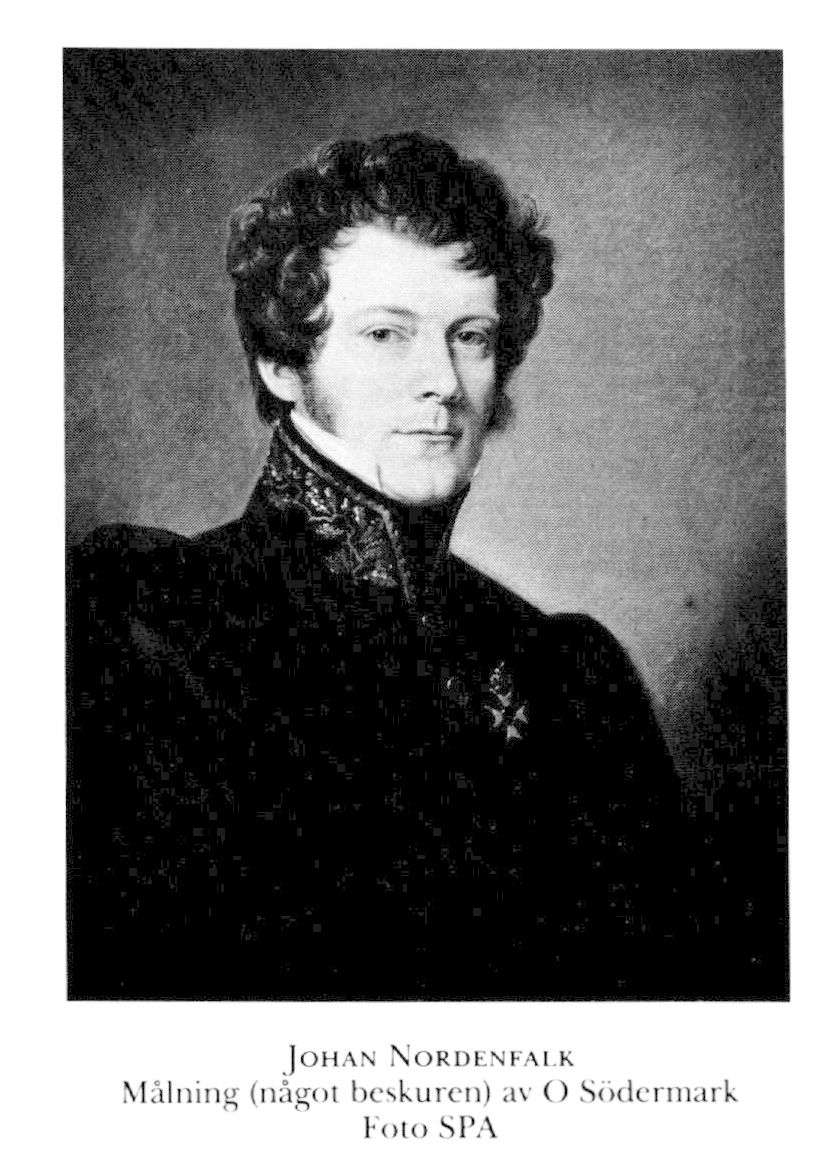 1 Nordenfalk, Johan, f 9 sept 1796 i Gålsjö, Vnl, d 9 mars 1846 i Sthlm, Klara. Föräldrar: brukspatronen Carl Fredrik N o Hedvig Sofia Hiärne. Elev vid Härnösands skola o gymnasium 05–14, inskr vid UU 26 sept 14, ex till rättegångsverken där 2 dec 16, auskultant i Svea hovrätt 19 dec 16, innehade domarförordnanden i Ångermanlands södra domsaga 18–19, eo notarie i Svea hovrätt 19 okt 19, v notarie där 27 jan 20, häradsh:s n h o v 10 juli 21, kopist i justitiefördeln av K M:ts kansli 10 nov 21, tf assessor i Svea hovrätt febr 23, tf revisions-sekr juni 23–28, deltog i riksdagarna 23–45 (led av lagutsk 23, statsrevisor 34–35 o 40–41, ordf i bankoutsk 40), prot:sekr i K M:ts kansli 30 dec 25, förste exp:sekr 19 dec 26, tf statssekr i krigsexp 27 febr 28, ord där 17 sept 28–26 febr 31, led av komm ang ny organisation av krigskoll sept 28–juli 29, av komm ang anslaget till försvarsverket febr–sept 30, av styr för Smålands privatbanks avd:kontor i Västervik 37, frih 4 dec 38, konsultativt statsråd 18 maj 44, justitiestatsminister o en av rikets herrar från 28 dec 44. – HedLKrVA 28, LLA 45, HedLLA 46.
