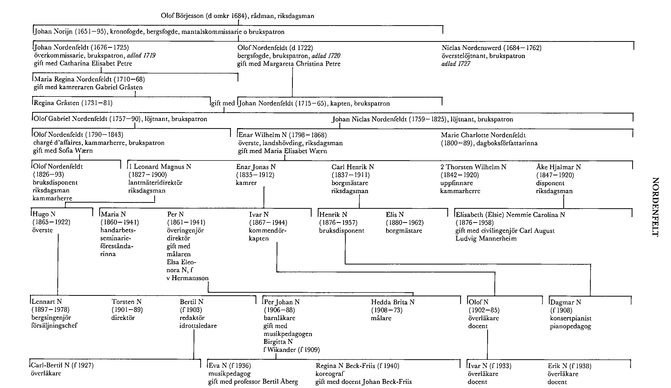 Olof Gabriel Nordenfeldts bror löjtnant Johan Niclas Nordenfeldt (1759–1825) ledde efter dennes död länge driften vid Björneborg under brorsonens omyndighet men sålde sin andel till denne 1818. I äktenskap med en syster till generalen greve Carl Henrik Posse blev han far till Marie Charlotte Nordenfeldt (1800–1889), vars omfångsrika dagböcker är en rik källa för kunskapen om familjens historia. Systrar till henne blev gifta med bergmästaren Erland v Hofsten (bd 19, s 191) och disponenten Nils Philip Mitander (bd 25, s 525), och en systerson var Claes Lorentz Grill (bd 17). Bror till dem var Enar Wilhelm N (1798–1868). Enar N invaldes i Götiska förbundet 1820, ingick i den sv observationskåren på Fyn 1848, befordrades till överste för Jönköpings regemente 1849 och var brigadbefälhavare på Gotland 1854–55 under Krimkriget samt landshövding i Blekinge 1856–67. Han deltog i en rad av ståndstidens riksdagar, röstade för representationsreformen vid riksdagen 1865–66 och var riksdagsman i FK 1867–68. N:s hustru var syster till statsrådet och landshövdingen Jonas Waern. En av deras döttrar blev gift med filosofen professor Yngve Sahlin. Bland de sju sönerna var uppfinnaren Thorsten Wilhelm N (N 2) och Åke Hjalmar N (1847–1920).