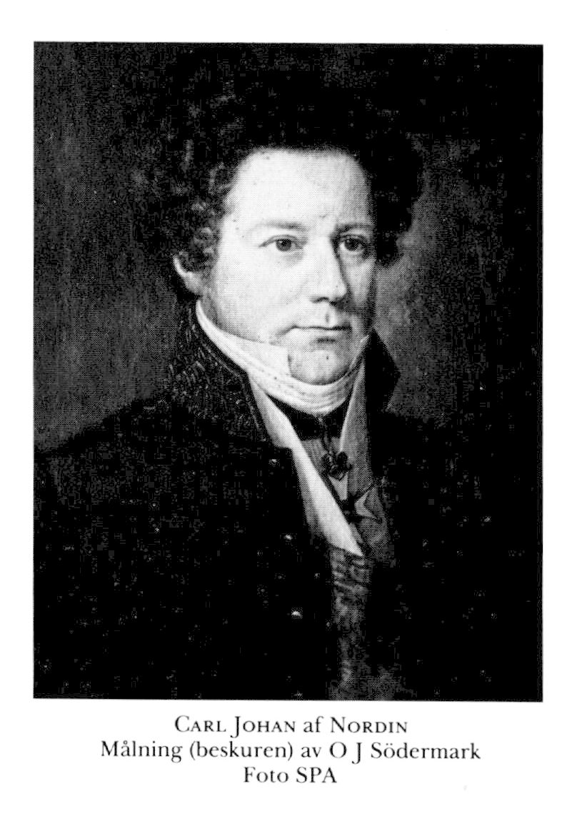 3 af Nordin, Carl Johan, son till N 1, f 6 aug 1785 i Valbo, Gävl, d 8 juni 1850 där. Kornett vid lätta dragonreg 15 febr 02, löjtn vid livg till häst 27 nov 06, ryttmästare där 19 sept 09, överstelöjtn:s avsked 14 nov 09, deltog i riksdagarna 09/10–40/41 (led av statsutsk 15U, 17/18U o 23, i bankoutsk 34/35–40/41), disponent vid Forsbacka bruk 23, chef för direktionen över Allm magasinsinrättn:s utredn 17 mars 24–25, statssekr i krigsexp 17 maj 25, led av komm ang flottans tillstånd o rikets sjöförsvar 26, av komm ang lönestat för indelta arméns befäl juni 26–okt 28, statsråd 16 jan 28–31, led av komm ang ny organisation av krigskoll sept 28–febr 29, av komm ang instruktion o stat för bergskoll samt mynt- o kontrollverken sept 28–april 32, tf överståth i Sthlm 24 okt 28–7 okt 30, ordf i komm ang beskattn: förhållandena i riket nov 30–dec 33, president i bergskoll 19 nov 31–3 aug 39, ordf i komm ang teknolog inst:s förändrade organisation dec 32– febr 34, i kommissionen ang undersökn av bergslags- o bruksdistrikten maj 33–nov 35, i direktionen för Göta kanal 7 febr 35–1 febr 36. – KorrespLLA 21, HedLLA 22, HedLKrVA 25, serafimerriddare 31 aug 29.