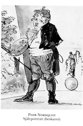 I flera teckningar karikerar N sig själv, gärna med framhävande av sin stora örnnäsa. I en svit bilder återger konstnären sin situation 1801 när hans utlandsresa blev fördröjd på grund av en vagnsolycka och han fick tillbringa en tid på ett värdshus i Helsingborgstrakten. Hans mellanhavanden med värdshusvärden "Munthen" skildras godmodigt spirituellt. N:s kvicka självironi avspeglar också både en positiv livssyn och en högaktning av vänskap.