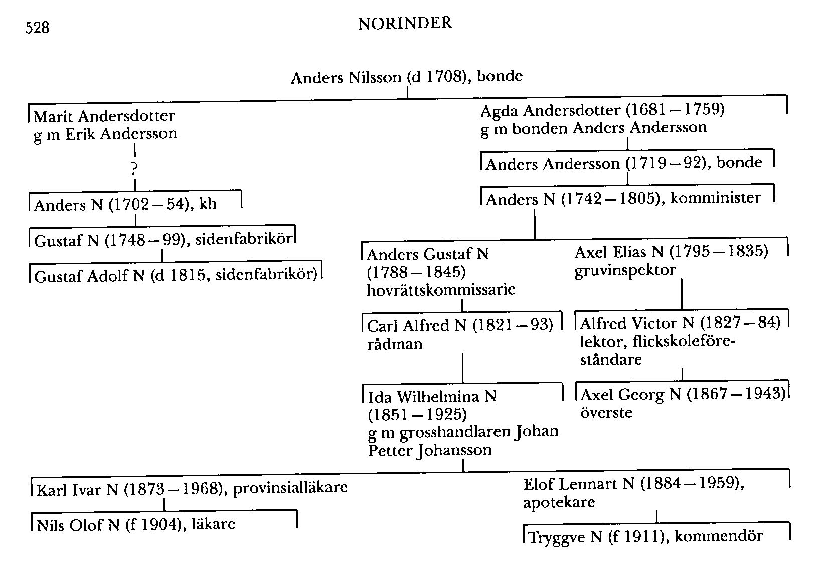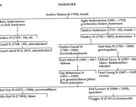 Norinder, släkt. Bonden Anders Nilssons (d 1708) i Bro, Nora, Vm, dotter Marit An-dersdotter hade i äktenskap med Erik Andersson i Öster-Lakbäck, Nora, sonen Anders, som var född 1702 och kan vara identisk med kh Anders N (1702–54) i Lovö, Sth, vilken uppges ha varit född just i Nora. Dennes son sidenfabrikören Gustaf N (1748–99) i Sthlm blev far till sidenfabrikören där Gustaf Adolf N (d 1815).