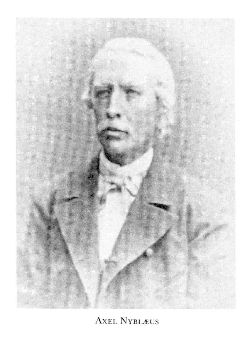 2 Nyblaeus, Johan Axel, kusin till N 1, f 20 maj 1821 i Sthlm, Ad Fredr, d 24 febr 1899 i Lund. Föräldrar: barnhusläkaren MD Johan Eric N o Charlotta Rebecka Windahl. Studentex vid UU o inskr där 10 juni 39, disp pro exercitio 20 febr 50, FK 9 mars 50, disp pro gradu 16 april 51, mag 16 juni 51, doc i filosofins hist 16 febr 52, allt vid UU, adjunkt i filosofi vid LU 27 aug 53, prof i prakt filosofi 23 maj 56–27 aug 86, led av mindre konsistoriet 60–61, 64–66, 71–72, rektor ht 63–vt 64, allt vid LU. – LFS 78, LWS 78, LVA 79.