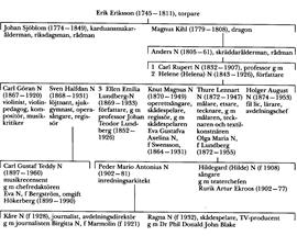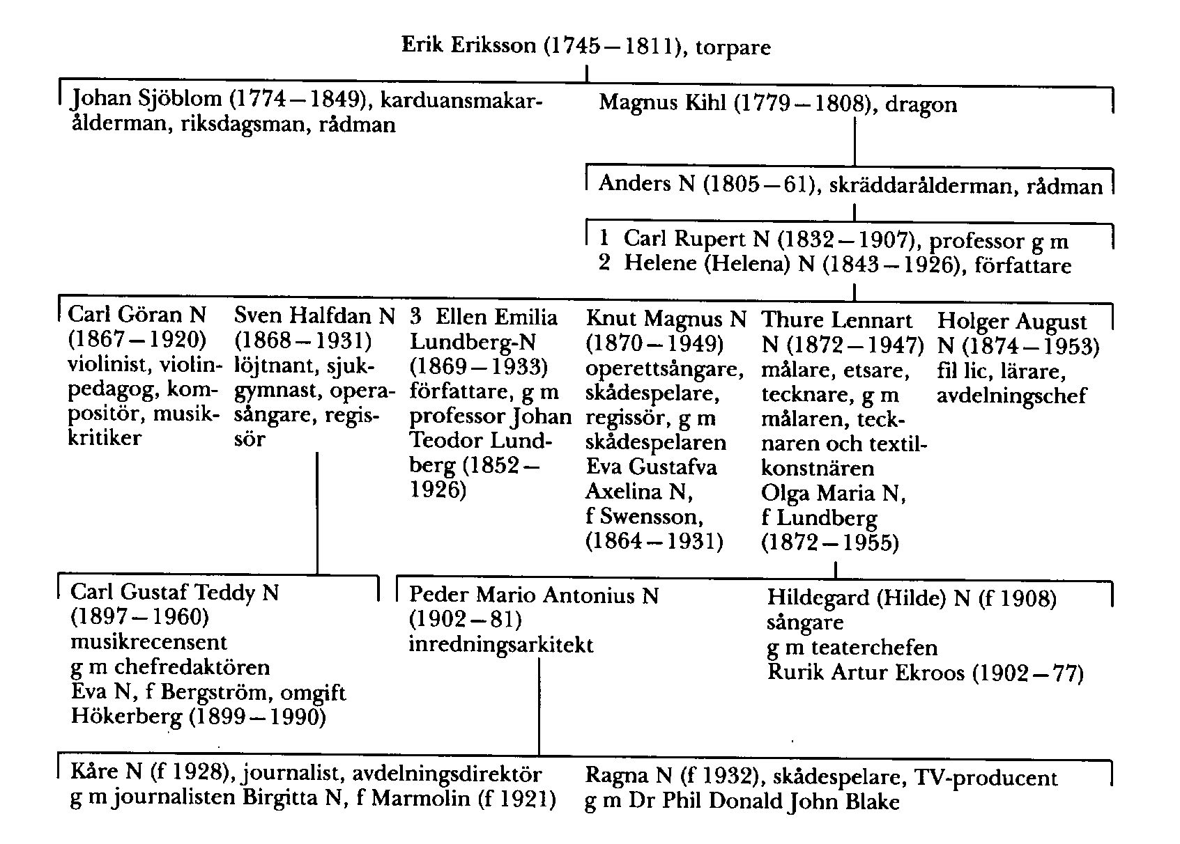 En yngre son till Erik Eriksson var dragonen Magnus KM (1779–1808) i Kivitok i Bromarvs sn i Nyland, som blev dödligt sårad i striden vid Pyhäjoki (jfr bd 8, s 551, och 24, s 602). Dennes son Anders N (1805–61) var skräddarålderman i Uppsala 1838–46 och blev 1843 ordförande i Uppsala borgerskaps äldste, 1847 den förste ordföranden i hantverksföreningen där samt 1855 illiterat rådman. Han blev far till professor Carl Rupert N (N 1), som i äktenskap med författaren Helene (Helena) Augusta N, f Roed (N 2), var far till författaren Ellen Emilia Lundberg-Nyblom (N 3) och till violinisten, violinpedagogen och kompositören Carl Göran N (1867–1920). Han var anställd i K hovkapellet 1898–1903 och verksam som musikkritiker i SvD, DN och från 1909 AB. 1916–19 var N redaktör för Sv musikerförbundets tidning Musikern. 1916–20 publicerade han fem häften i serien Kortfattade lefnadsteckningar om framstående tonsättare. N var också tecknare och akvarellist.