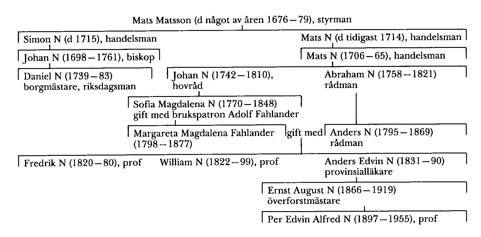 1 Borgaren i Uleåborg Mats Matsson, även kallad Mats styrman (d något av åren 1676–79) var far till handelsmannen Simon N (d 1715, 50 år gammal) i Uleåborg. Namnet N antogs även av ättlingar till systersöner till Mats Matssons hustru (Aström 1983, s 19).