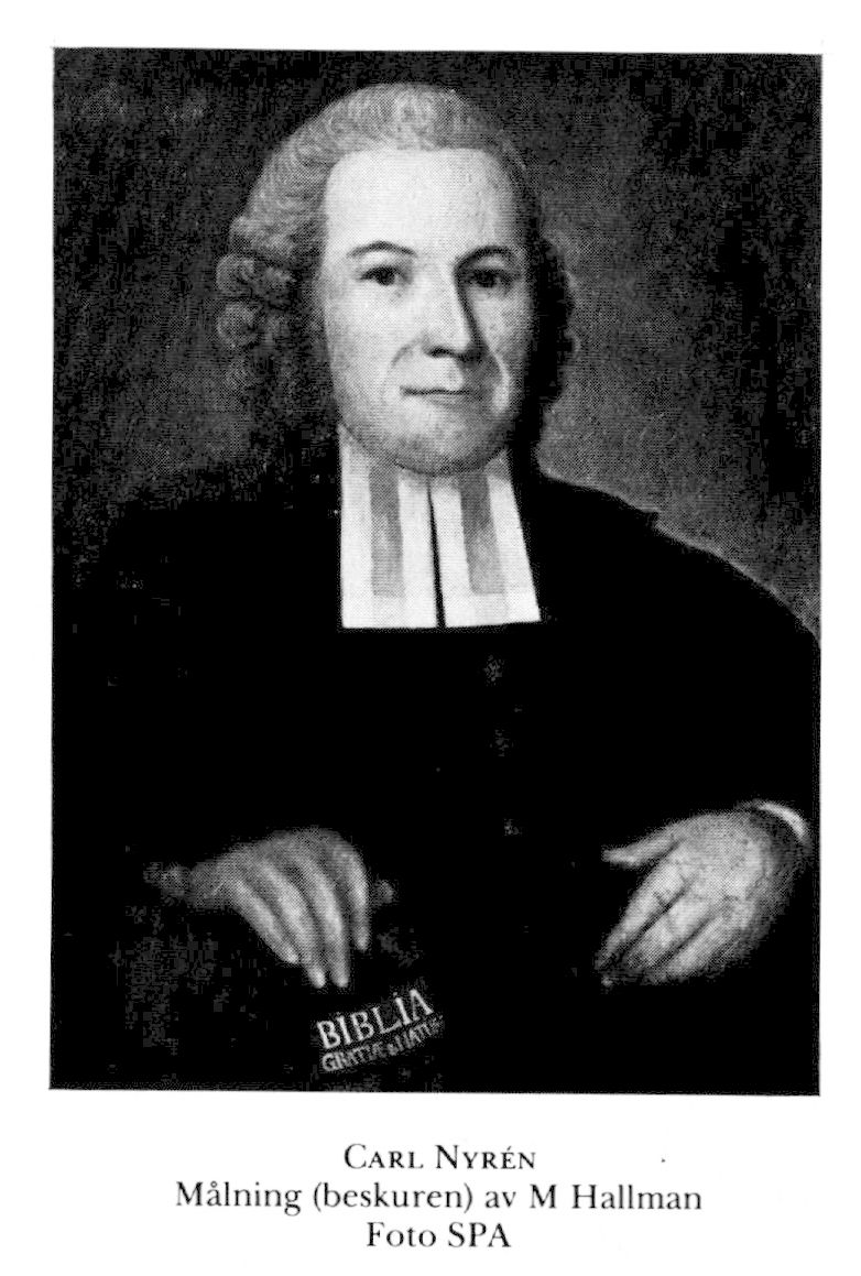 Nyrén, Carl, f 30 aug (N, Charakters Skildringar ...), dp 2 sept 1726 i Gammalkil, Ög, d 25 jan 1789 i Kuddby, Ög. Föräldrar: trumpetaren Peter Nyman o Christina Magdalena Wallberg. Elev vid Linköpings gymn, inskr vid LU 20 sept 49, konsistorieamanuens juli 50, tf akademisekr 13 aug 51–dec 52, disp pro gradu 31 maj 54, allt vid LU, stads- o manufakturfiskal i Alingsås 54, v direktör vid manufakturverket där 30 aug 55–61, fil mag vid LU 2 juli 57, inskr vid UU 15 juni 61, plantagedirektör i Östergötland o lektor i ekonomi o naturalhist vid Linköpings gymn ht 62, lektor i grekiska där 23 april 66, prästv 21 dec 66, kh i Kuddby 4 dec 70 (tilltr 1 maj 71), kontraktsprost 10 april 71, TD vid Königsbergs univ 13 april 83. – LPS 81.
