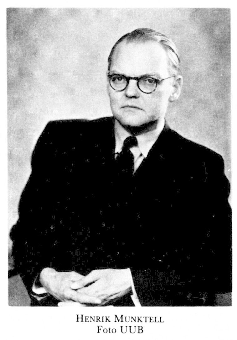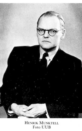 6 Munktell, Axel Henrik, sonson till M 4, f 1 dec 1903 i Grycksbo, Kopp, d 20 dec 1962 i Uppsala. Föräldrar: disponenten Henrik August M o Clara Mathilda Sandström. Studentex vid Falu h a l 5 juni 23, inskr vid UU 31 aug 23, FK 15 dec 25, JK 14 sept 29, JL 15 dec 33, disp 31 jan 34, doc i rättshist 14 febr 34, JD 31 maj 34, allt vid UU, tf prof inom jur fak vid UU o LU 8 mån mars 35–maj 36, tf prof i rättshist vid UU 19 juni 36–42, prof i samma ämne där från 13 mars 42, sekr i statens informationsstyr 10 april–20 sept 40, led av styr för Inst för rättshist forskn från 47, ordf i Uppsala högerfören 47–51, v ordf i Uppsala läns högerförb från 51, led av International Commission of Jurists o dess arbetsutsk, Genève, från 52, led av AK från 53 (led av tredje lagutsk från 58), av Uppsala läns landsting 55–58, av komm ang åtgärder mot ungdomsbrottsligheten nov 56–okt 62, av författn:utredn från maj 59, av styr för riksdagsbibl från maj 61. – LHVU 61.