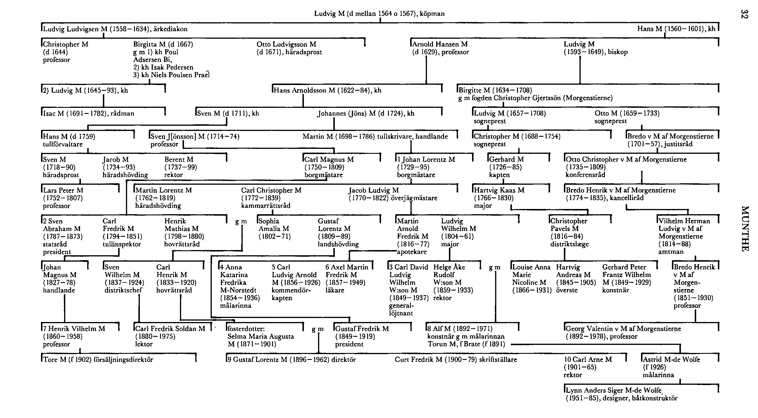 Källor o litt: Allmänt: Xeroxkopior bl a av brev till sedermera byråchefen Richard M från riksar-kivarien Carlos Wyffels i Gent 25 sept 1953 o av prof B Hildebrands PM om släkten M 15 mars 1962, SBL (efter förlagor hos fil dr Ingegerd Hil-debrand, Sthlm); [J A] A[lm]qu[is]t, rec av L o Å W:son M, nedan a a (PHT 1932); B Lager , rec av Curt M, nedan a a (PHT 1964); [Arne M,] M (Kalender över ointroducerad adels förening, 2, 1936); Curt M, M från Flandern, släktens sv öden (1963); Hartvig M, Efterretninger om Familien M i aeldre og i nyere Tid (1883-88); Ludvig W:son M, M-slägten från medlet af 1000-talet till närvarande tid (1883); dens o Åke W:son M, Släkten M i Sverige (1931); L Påhlsson, Kalender över ointroducerad adels förening (1970); Sv släktkal, 7 (1919); C H Tersmeden, Kalender öfver i Sverige lefvande ointroducerad adel, 2 (1899); C v Warn-stedt, Kalender över ointroducerad adels förening (1975); L Wikström, d:o (1985); Omberg, 2 (1886; tr 1885). — Comelius Munthen: Xeroxkopia av adelsbrevet 1626, SBL (efter fotokopia hos fil dr Ingegerd Hildebrand, Sthlm); Des neuen Teut-schen Wappenbuchs vierdter Theil (1657); K F v Frank, Standeserhebungen und Gnadenakte fur das Deutsche Reich und die Österreichischen Er-blande bis 1806 ..., 3 (1972), s 275. - Härstamningen från Flandern: E Bring, Tal wid ... Sven M:s begrafning (1790), s 10. — Härstamningen från Bra-bant: E Pontoppidan, Annales ecclesiae Danicae dip-lomatici, 4 [1752], s 237; G J Sommelius, Skånska clericiets hist, 3 (1763), s 50; G Treschow, Danske Jubel-Laerere (1753), s 179; D G Zwergius, Det Siellandske Clerisie (1754), s 564. — Ludvig M (d mellan 1564 o 1567): Xeroxkopia av "Paludaners Genealogie" i Genealogisk-Heraldisk Selskabs Samling i DRA, brevsvar 10 sept 1986 från Archiv der Hansestadt Liibeck, SBL. — Ludvig Ludvigsen M: J Corylander, Berättelse om Lunds domkyrka (1884); Frederik II ens og Formynderstyrelsens Hof- og Regeringspersonale 1558—96 (Meddelelser fra Rentekammerarchivet 1873—76), s 202; Kan-celliets Brevbager 1580-83 (1903); d:o 1584-88 (1906); d:o 1588-92 (1908); d:o 1596-1602 (1913); d:o 1603-08 (1915); d:o 1609-15 (1916); d:o 1616-20 (1919); d:o 1624-26 (1925); H F Rerdam, Mester Hans Michelsen, Christian IVs La:rer (Ny kirkehist Samher, 6, 1872—73); dens, Magistre creerede ved Kjebenhavns Universitet fra Reformationen indtil 1660 (Personalhist Tidsskr, 3, 1882). - Christopher M: H Ehrencron-MöIIer, For-fatterlexikon omfattende Danmark, Norge og Island indtil 1814, 5 (1927); Lunds hm, 2:5 (1954), s 573. - Otto Ludvigsson M: Lunds hm, 2:9 (1963). -Ludvig M (d 1693): d:o, 2:5 (1954): - Hans M (d 1601): Die M der Univ Rostock, 1 (1889); L H F de Fine Olivarius, Stamtavler over Slaegterne Olivari-us og de Fine (1894); Frederik IIdefls og Formynderstyrelsens Hof- og Regeringspersonale 1558—96 (Meddelelser fra Rentekammerarchivet 1873—76), s 203; Kancelliets Brevheiger 1584-88 (1906); Rer-dam, a a 1872—73; S V Wiberg, Personalhistoriske, statistiske og genealogiske Bidrag til en almindelig dansk Prastehistorie, 3 (1871), s 322 f. - Ludvig M (d 1649): G Engelbrecht, En kort Ligprediken ofver Ludvig M (1650); Lunds hm, 2:4 (1952); Norsk biografisk leksikon, 9 (1940); Wiberg, a a, 2 (1870), s 114. — De norska släktgrenarna: Ms 98 b, UB, Bergen; C Giessing, Nye Samling af Danske, Nor- skeog Isländske Jubel-Laerere, 2:1 (1781), släkttavla mellan s 366 o 367; J C L Lengnick, Genealogier over adelige og borgerlige Familier, 2:2 (1851); Norsk biografisk leksikon, 9 (1940), särsk släkttavla s 488 f; Norsk slektskalender, 2 (1951). - Bredo v M af Morgenstieme: DBL 10 (3. upp, 1982). - Släktgrenen von M af Morgenstieme: DAA 32 (1915); Lengnick, a a, 1 (1844). — Georg Valentin von M af Morgenstieme: Norsk biografisk leksikon, 9 (1940); Sv uppslagsbok, 20 (2. uppl, 1951); Väd? 1941 (1940). - Arnold Hansen M: Lunds hm, 2:4 (1952), s 385 f. — Hans Amoldsen M o Sven M (d 1711): Lunds hm, 2:3 (1951). - Hans M (d 1759): G Bergström, Tullförvaltarna i Halmstad 1645—1900 (Föreningen Gamla Halmstads Å, 39, 1962), s 47 f; dens o B Bergström, d:o i Hälsingborg 1658—1900 (Kring Kärnan, 9, 1968), s 136 f; Helsingborgs hist, 5:1,3 (1979). - Jacob M: M 1260, Ericsbergsarkivets autografsaml, RA; Lags o doms; H Schuck, Gustavianska brev (1918), s 405, 645; SjSkl; M Wei-bull o E Tegnér, LU:s hist 1668-1868, 2 (1868). -Berent M: O Waldes katalog över gods- o släktarkiv samt enskilda personers brev o papper i offentliga institutioner o i enskild ägo, UUB (xeroxkopia i bla RA); NF, ny uppl, 18 (1913); SjSkl; Weibull o Tegnér, a a. — Scen M (d 1790): Biograph lexicon öfver namnkunnige sv:a män, 9 (1843); Bring, a a; A U Isberg, Bidrag till Malmö stads hist, 1 (1895); Lunds hm, 2:2 (1948); NF, ny uppl, 18 (1913); SjSkl. — Lars Peter M: J Agrell, Nyinrättade professurer inom filosofiska fakulteten i Lund under 1800-talets första hälft (1949); J E Almquist, Sv juridisk litteraturhist (1946); S Bohman, Esaias Tegnérs tänkesätt o idéer (1933), s 27, 100, 110— 114, 143; I Brohed, Stat - religion - kyrka, ett problemkomplex i sv akademisk undervisning under 1700-talet (1973); F Böök, Esaias Tegnér, 1 (1917), s 72 f; dens, d:o, 1 (1946), s 48, 61; K Gierow, 1790-1867 (LU:s hist, 3, 1971); A Hylan-der, Minne af framlidne professorn L P M (1807); G Johannesson, 1710-89 (LU:s hist, 2, 1982); A Kahl, Tegnér o hans samtida i Lund (1851), s 34; A Nilsson, Tegnérs filosofiska o estetiska studier (E Tegnér, Filosofiska o estetiska skrifter, 1913), s 29-32; A Nyman, Från Platon till Einstein (1933), s 103, 109; B Rehnberg, Prästeståndet o religionsdebatten 1786-1.800 (1966); T T Segerstedt, Moral sense-skolan o dess inflytande på sv filosofi (1937); SjSkl; SMoK; E Tegnér, Samlade skrifter, 1, 8-10 (1923-25); E Tegnérs brev, 1, 11 (1953-76); E Tykesson, Rövarromanen och dess hjälte (1942); Ur Esaisas Tegnérs papper (1882); K War-burg, Johan Gabr