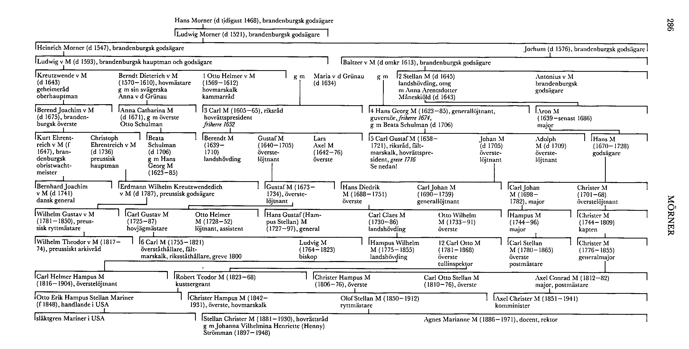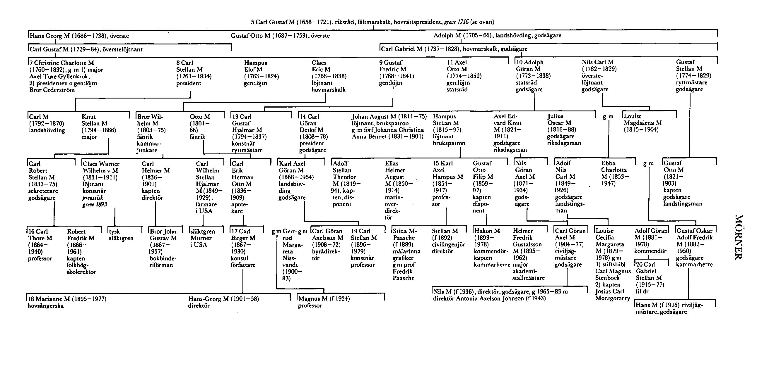 Äldre bror till M 12 var Hampus Wilhelm M (1775–1855). Hampus M deltog i kriget i Pommern 1807 och i Norge 1808 samt utmärkte sig vid Oravais s å och vid Sävar 1809, där han blev lätt sårad. Han befordrades till överste i generalstaben 1816, blev kommendant i Sthlm 1818 och var 1821 (tf 1820)–1841 landshövding i Västernorrlands län, där en landskamrers och en räntmästares balanser ledde till M:s konkurs och minskade hans pension (X 240). Som pensionerad bosatte han sig i Linköping, där han blev ordförande i stadens nykterhetsförening. M var också känd för sin varma, herrnhutiskt färgade fromhet, och hans hem utgjorde en samlingspunkt för de evangeliskt väckta. Han publicerade bl a memoarboken Några glada och sorgliga minnen af en lång lefnad (1848). Rester av M:s arkiv har bevarats hos ättlingar till honom (Wikmark, s 663). Son till honom var Carl Helmer Hampus M (1816–1904). Helmer M blev 1862 överstelöjtnant och var 1862–75 chef för Jämtlands fältjägarkår. Den ene av hans söner var först verksam i handelsflottan i Australien och sedan vid diamantfälten i Sydafrika. Med den andre, som var svärfar till skeppsredaren Sven Salén, utdog friherrliga ätten M af Morlanda på manssidan i Sverige 1946.