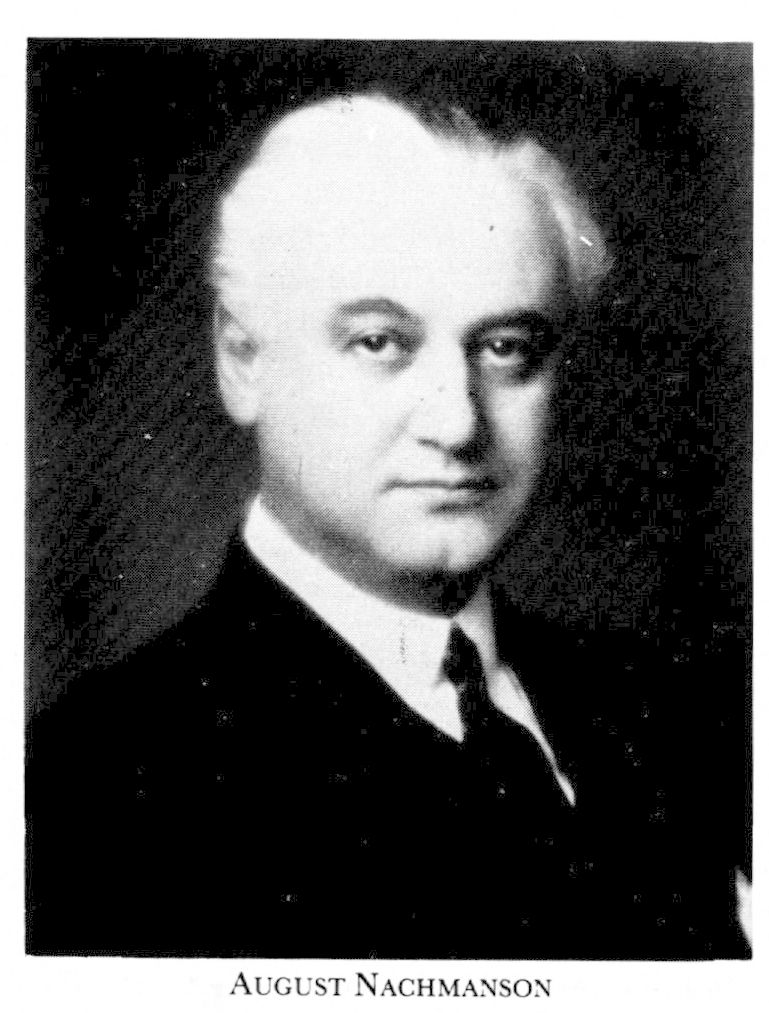 3 Nachmanson, August, bror till N 1 o N 2, f 17 april 1878 i Sthlm, Mosaiska, d 3 nov 1946 där, Osc. Elev vid Sthlms norra latinlärov o Östermalms allm lärov 87–95, vid Marieborgs folkhögskola, Östra Eneby, Ög, 95–96, vid Klagstorps lantbruksskola, Norra Kyrketorp, Skar, 96–98, vid Ultuna lantbruksinst 98, utex där 00, lär vid Klagstorps lantbruksskola 00–01, skattmästare i Centrala nödhjälpskomm för avhjälpande av nöden i Norrland 01–02, innehade o brukade Trystorps säteri, Tångeråsa, Ör, 03–07, arrenderade Kåvö gård, Hovsta, Ör, 07–11, deläg i W Hjelmqvists jur byrå, Örebro, 08–11, led av styr för Nya Garphytte fabriksab 11–13, VD för Orkla Grube A/S, Norge, april 12–22, led av styr där 12–42, VD i ab Emissionsinst från 14 (14–23 tills med Emil Lundqvist, bd 24), ordf i styr för ab Garphytte bruk från 15, kassadir och led av styr för Sv slöjdfören 16–31, led av styr för ab Oskarshamns kopparverk 17–36, av styr för ab Nordströms linbanor 18, ordf där från 24, led av styr för ab Fiducia 21–28, av styr för ab Henriksborgs fabriker 21–37, av styr för Sv oljeslageri ab 21–42, v ordf i styr för ab Sv järnvägsverkstäderna från 32, led av styr för ab Oskarshamns varv (från mars 34 ab Varvintressenter) 32–37, ordf i styr för ab Elektrisk malmletning från 34, i styr för Sv diamantbergborrnings ab från 35, led av styr för Baltiska oljeab från 35, av styr för Tambo gruvab 38–40, ordf i styr för Mineral-Invest ab från 38.