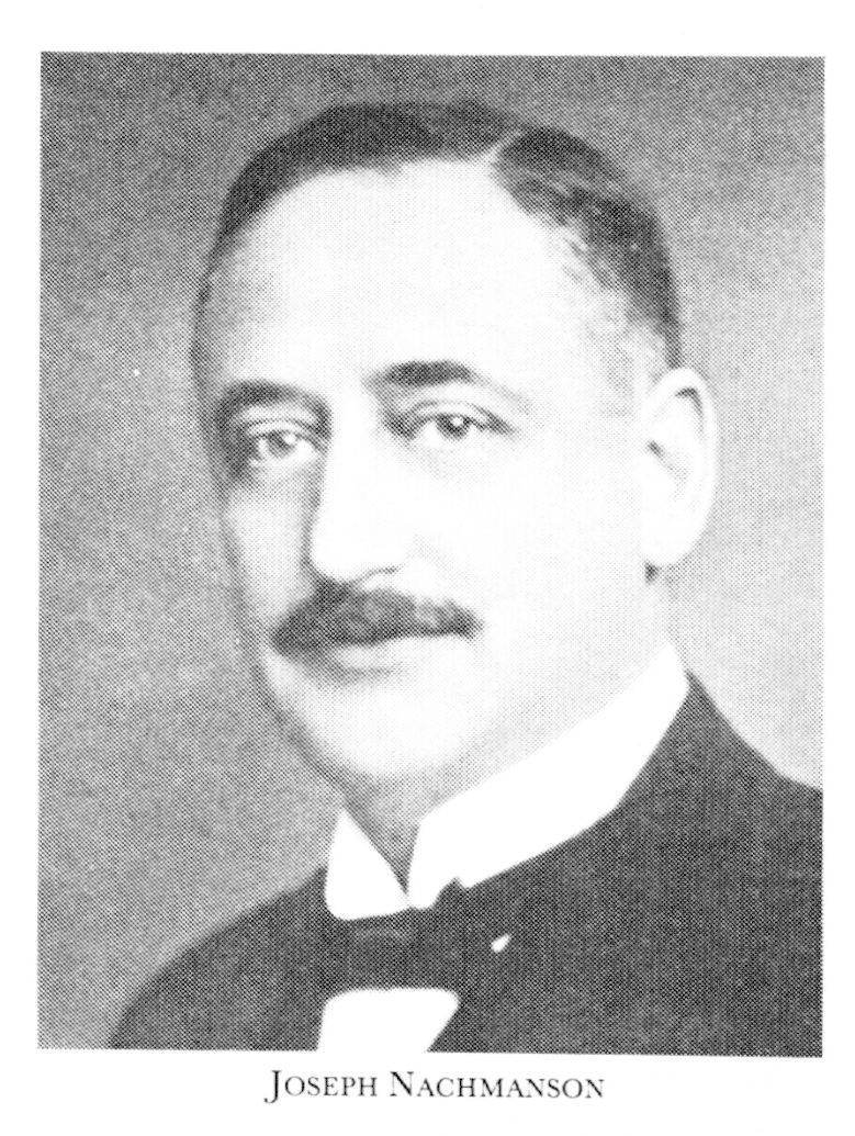1 Nachmanson, Joseph, f 12 jan 1876 i Sthlm, Mosaiska, d 13 juni 1927 i Saltsjöbaden (enl db för Engelbr, Sthlm). Föräldrar: grosshandlaren Herrman N o Rosa Davidson. Grosshandlare i manufakturbranschen 01–10, led av styr för Tidn:ab Sverige 02–04, av styr för Sthlms köpmannafören 05–10, fullm i Sthlms handelskammare 06–11, led av styr for Sthlms handelshögskoleforen från 06, av Sthlms hamnstyr 09–12, av dir för Sthlms handelshögskola från 09, av styr för Sthlms ensk bank från 09, kassadir 10, v VD 10–20, VD där från 20, led av styr för Nordiska manufakturab från 10, för ab Diligentia från 11, för Järnvägsab Sthlm–Saltsjön från 13, för ab Investor 16–våren 27, för ab A Wiklunds maskin- o velocipedfabrik o Sthlms rederiab Svea från 16, för Sthlm–Västerås-Bergslagens nya järnvägsab 17–27, för ab Atlas Diesel från 17, led av 1918 års penningvärdeskomm juni–juli 18, av styr för ab Järnförädling 18–21, för Sv kronkreditab (från maj 23 Sv obligationskreditab) 18–26, för Kopparbergs o Hofors sågverksab o Storviks sulfitab från 18, för Wifsta varfs ab från 19, för ab Kreditkassan av år 1922 22–26, för ab Lånekassan av 1914 23–27, innehade även styr:uppdrag i Sv bankfören, Sv sällsk för med forskn o Sv cancerfören:s sthlmsavd.
