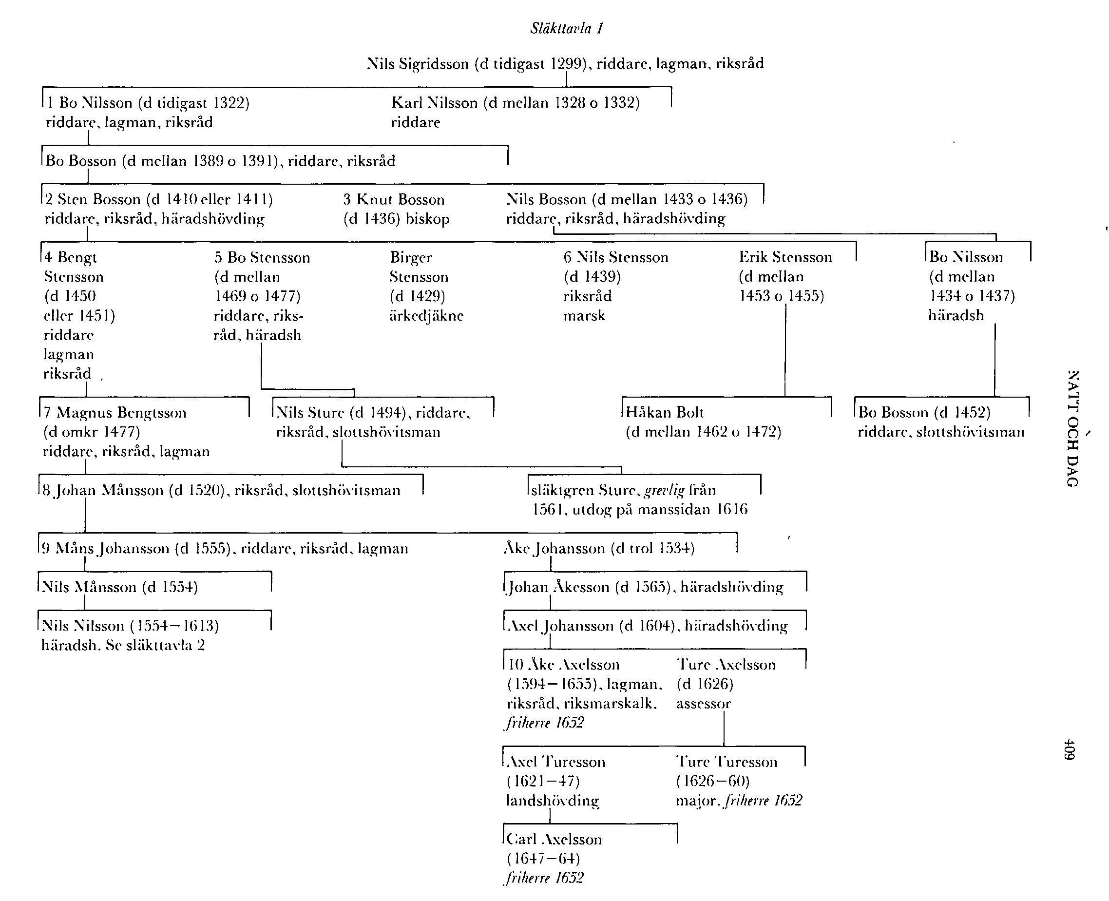 N:s äldre son, riddaren, riksrådet och östgötalagmannen Bo Nilsson (N 1), blev i äktenskap med en dotter till drotsen Knut Jonsson (Aspenäsätten; bd 2) morfar till drotsen Bo Jonsson (Grip; bd 5). Bo Nilssons son Bo Bosson (d mellan 1389 o 1391) bodde 1382 på sin farfars f d sätesgård Ringshult. Han torde — såsom framgår av förnamnet (Engström, s 7) — ha varit född postumt, vilket styrkes av att modern 1336 nämner honom som sin yngste son och av att han därefter ej kunnat beläggas i urkunderna förrän 1356, då han beseglar ett brev åt en morbror. B namnes då med herrtitel, vilket visar, att han vid obekant tidpunkt blivit dubbad till riddare, men därefter förekommer han ej förrän 1364, då han — utan att vara nämnd i texten — beseglade konung Albrekts brev om indragning av en tredjedel av fattigtionden i Linköpings stift till kanikerna vid domkyrkan. 1371 uppträder han liksom sin systerson Bo Jonsson bland de talrika representanterna för Albrekt, då stillestånd vid Edsviken i Sollentuna norr om Sthlm slöts med konungarna Magnus' och Håkans anhängare. 1374 namnes B främst bland åtta personer som tillsammans med Bo Jonsson fick lejd för förhandlingar med konung Albrekt. Först 1376 kan han beläggas som riksråd. I Bo Jonssons testamente 1384, vars främste sigillant B var, blev han och hans barn ihågkomna med tusen lödiga mark på villkor att de skulle hjälpa exekutorerna att fullfölja testators intentioner. Han namnes i livet senast hösten 1389, då han förekommer bland utfärdarna av ett brev på mötet i Söderköping, där drottning Margareta definitivt övertog makten i Sverige och Bo Jonssons testamentsexekutörer överlämnade de flesta av rikets slott till henne. En av B:s döttrar blev stammoder till riksföreståndaren Sten Sture d ä.