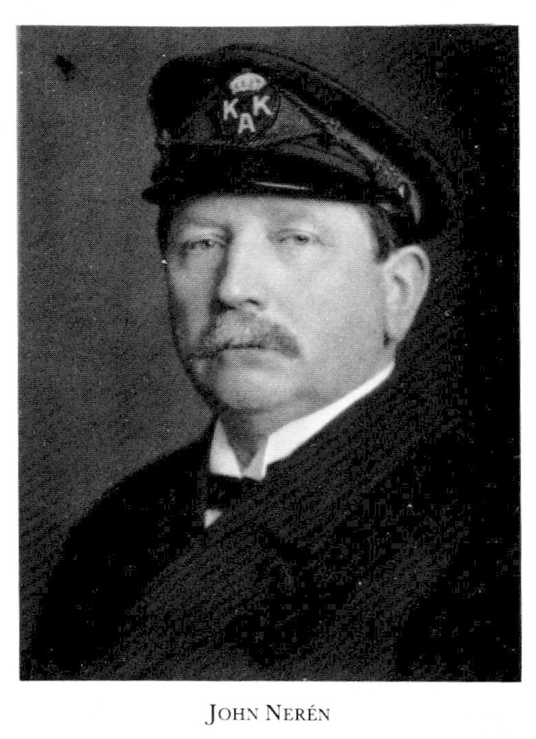 Nerén, Johan (John), f 2 sept 1871 i St Mellösa, Ör, d 4 febr 1956 i Sthlm, Kungsh. Föräldrar: lantbrukaren Jan Erik Erikson o Hilda Charlotta Åhlström. Mogenhetsex vid h a l i Örebro vt 91, jungman o lättmatros 92–95, ångfartygsbefälh:ex vid Sthlms navigationsskola 95, kypare, bokhållare o disponent i Kapstaden o Johannesburg 96–01, inneh av Swedish Exporting Co i Johannesburg 02, chef för bilavd hos ab A Wiklunds maskin- o velocipedfabrik 07, inneh av ab John Nerén & co 10–12, av Neréns bilskola 10–14, av navigationsskola 10–16, chef för Seth A Högmans bilavd 12–14, besiktn:man av bilar o motorbåtar åt magistraten i Sthlm o Sthlms handelskammare 18–42.