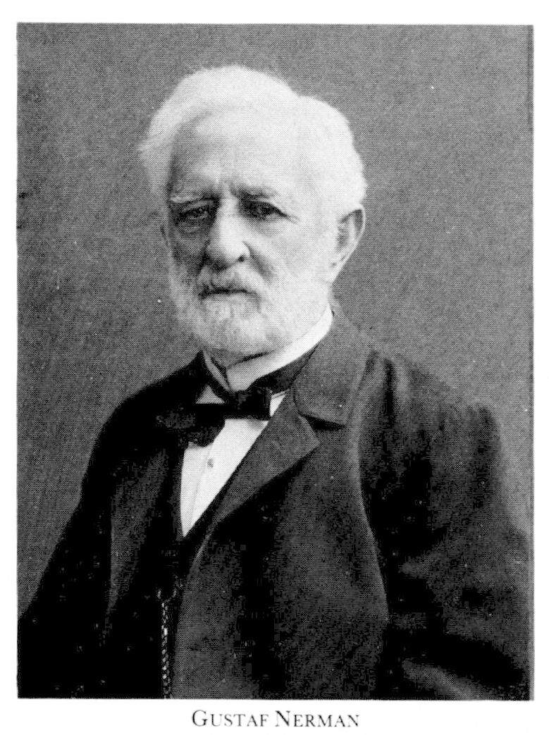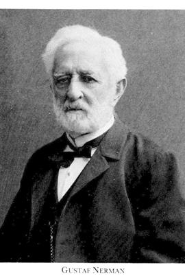 2 Nerman, Gustaf Magnus, brorson till N 1, f 6 juli 1827 i Sthlm, Livg till häst, d 12 jan 1913 i Uppsala. Föräldrar: livmedikus Wilhelm Samuel N o Emma Elisa Melin. Studentex vid UU 4 dec 46, elev vid h art:lärov på Marieberg, Sthlm, 1 okt 47, civilingenjörsex där 17 aug 51, löjtn i väg- o vatten-byggn:kåren 13 mars 52, arbetschef vid byggandet av Norrköping–Fiskeby järnväg 54 o järnvägen Norberg–Åmänningen 54–56, vid kajbyggn i Norrköping 56, kapten i väg- o vattenbyggn:kåren 16 dec 59, distriktsingenjör vid statens järnvägsbyggnader 60–62, anställd i väg- o vattenbyggn:styr från 19 juni 63, arbetschef vid slussbyggn i Eskilstuna 65, led av Sthlms stadsfullm 1 april 65–82 (led av drätselnämndens första avd 66–82), tf byråchef i väg- o vattenbyggmstyr 29 sept 70, disponent för Sandarne mek snickerifabrik 70 — 77, major i väg- o vattenbyggn:kåren 26 febr 75, distriktschef i mellersta väg- o vattenbyggn:distr 26 febr 75–28 okt 92, avsked från väg- o vattenbyggn:kåren 24 nov 93.
