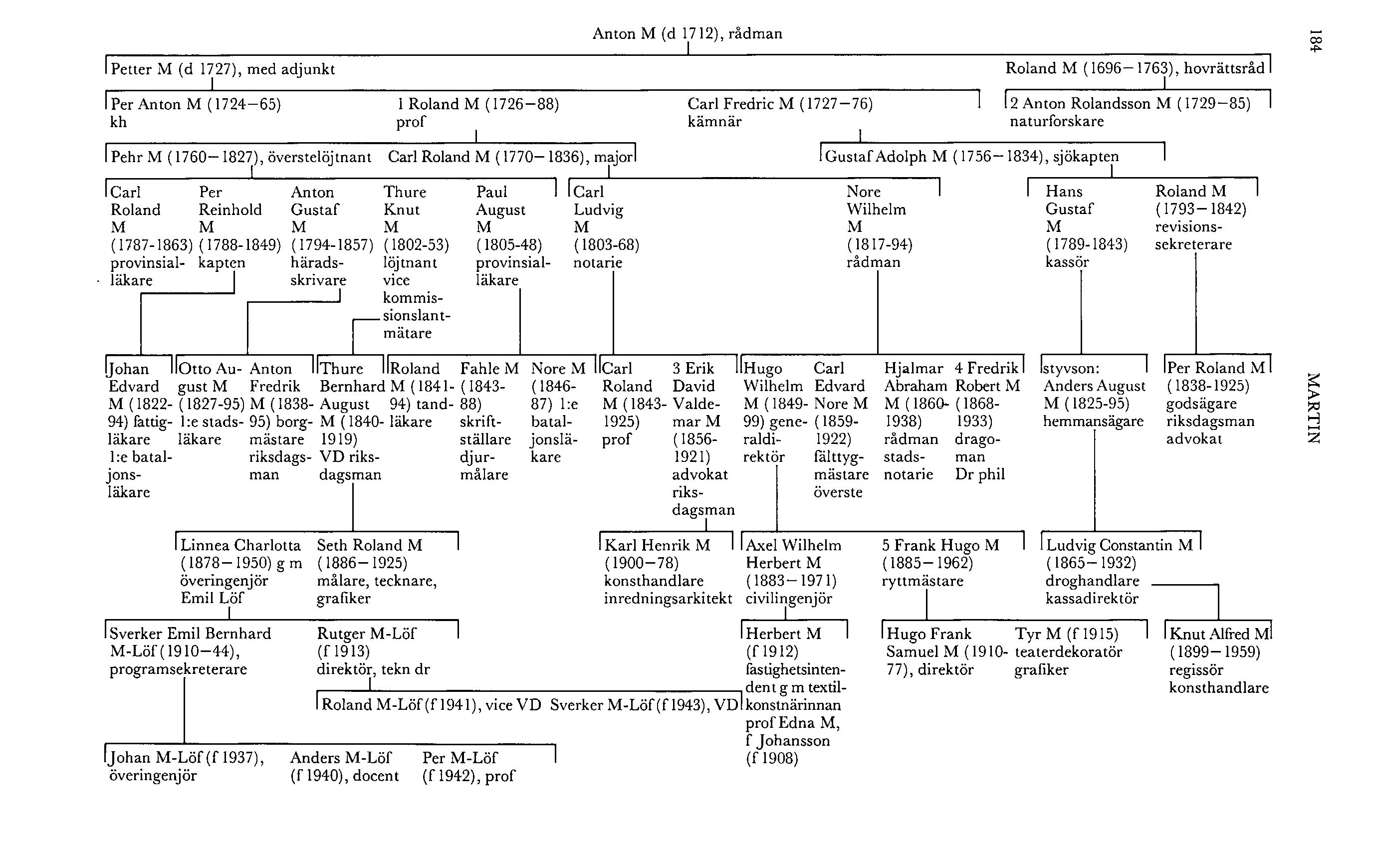 M 5:s farfars farbror Pehr M (1760–1827) deltog i kriget i Finland 1788–90, befordrades till major 1800 och blev sjukhusintendent vid armén i Pommern 1805, överstelöjtnant 1809 och kommendant på Vaxholms fästning 1821. I äktenskap med en syssling på den rudbeckska sidan, som var dotterdotter till Carl von Linné, var han far till med doktorerna Carl Roland M (1787–1863) och Paul August M (1805–48), provinsialläkare i Nyköping resp Enköping. Paul M:s son tandläkaren Roland M (1841–94) var föreståndare för Sthlms stads poliklinik for tandsjukdomar 1872–94, sekreterare i Tandläkaresällskapet i Sthlm 1875–85 och ordf i Sv tandläkaresällskapet 1886–87. Han skrev bl a Sveriges tandläkarehistoria (1881), Kortfattad tandläkemedelslära (1887), som var den första i sitt slag i vårt land, Om artificiela (konstgjorda) tänder samt några ord om de s k tandteknici (1890), Matrikel jemte biogr uppgifter öfver Sveriges tandläkare från äldre till nuvarande tid (1890) och Vägledning vid receptskrifning (1891) samt utgav Skandinavisk tidskrift för tandläkare 1887–89 och Tidskrift för tandläkare 1894. Bröder till honom var skriftställaren och djurmålaren Fahle M (1843–88) i Sthlm och förste bataljonsläkaren Nore M (1846–87) på Karlsborg. Deras farbror kapten Per Reinhold M (1788-1849) var far till fattigläkaren och förste bataljonsläkaren med dr Johan Edvard M (1822-94) i Sthlm. En annan farbror, häradsskrivaren Anton Gustaf M (1794–1857), var far till förste stadsläkaren Otto August M (1827–95) i Södertälje, som valdes till riksdagsman i AK 1893 men insjuknade och avsade sig detta uppdrag. Bror till honom var borgmästaren i samma stad Anton Fredrik M (1838–95), som var riksdagsman i AK 1887–90. Ytterligare en farbror var löjtnanten och vice kommissionslantmätaren Thure Knut M (1802–53), som var far till Thure Bernhard August M (1840–1919). Bernhard M var jägmästare och skogsförvaltare vid Strömsbergs bruk i Tolfta och Örbyhus i Vendel, båda Upps, 1864–90, riksdagsman i AK 1879–81, disponent för Hudiksvalls trävaruab 1890–93 och VD för Korsnäs sågverksab 1894–1908. Son till honom var målaren, tecknaren och grafikern Seth Roland M (1886–1925), som var svärfar till flygaren Carl Gustaf von Rosen.