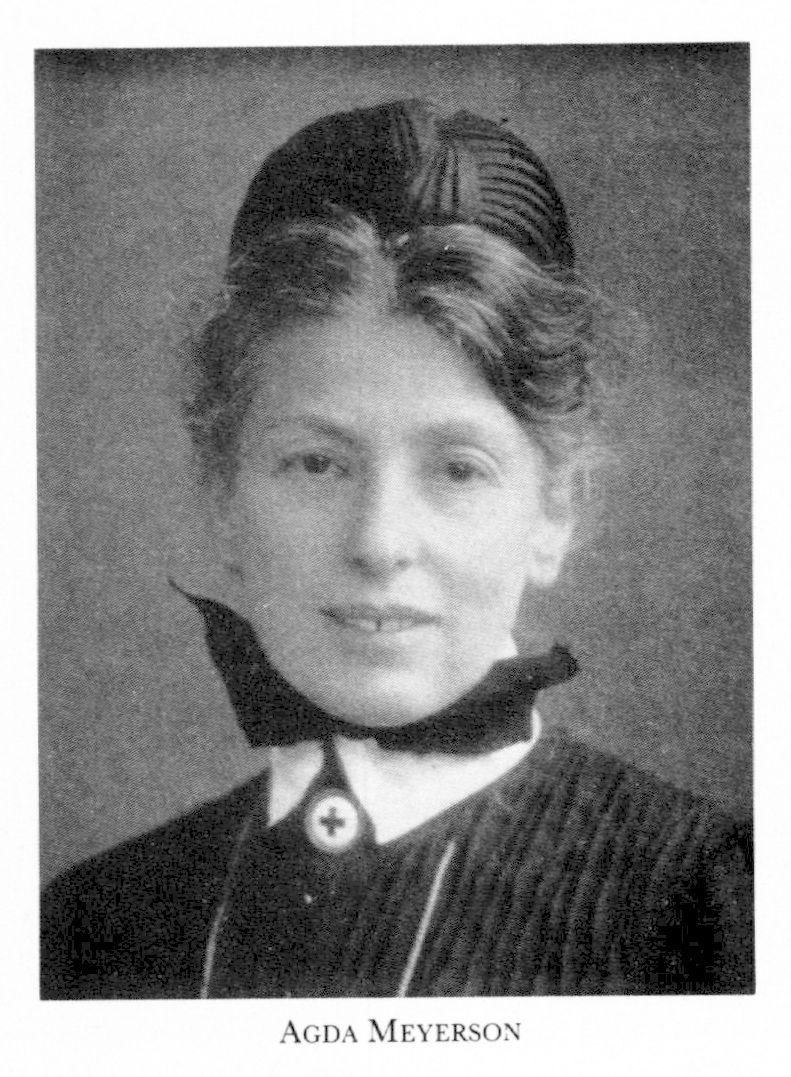 1 Meyerson, Agda Sofia, f 1 febr 1866 i Sthlm, Mosaiska, d 27 dec 1924 där, Hedv El. Föräldrar: dir Herman August M o Betty Hirsch. Elev vid Åhlinska skolan i Sthlm, vid slöjdlärarinnesem i Nääs, Skallsjö, Älvsb, genomgick Sabbatsbergs sjuksköterskekurs 96–97, kurser vid barnsjukh Samariten o Kronprinsessan Lovisas vårdanst 97, översköterska vid Bernhardts sjukhem, Sthlm, 98–07, förest för Syster Agdas sjukhem där 08–17, led av Israeliska sjukhjälps- o begravn: sällsk 09, v ordf i styr för Sv sjuksköterskefören 10, sekr i komm ang sjuksköterskornas arbetsförhållanden juni 12–maj 18, även led av komm jan 14–maj 18, led av styr för fören Sommarhem för konvalescenter från 13, förest för Sv sjuksköterskefören:s hem från 17, led av styr för Ålderdomshem för sjuksköterskor 19, av arbetskomm ang sjuksköterskornas samarbete i Norden 20, sekr i styr för sjuksköterskornas understödsfond 23. – Ogift.