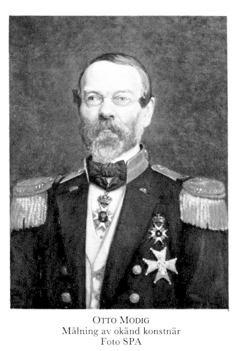1 Modig, Johan Otto, f 20 dec 1803 i V Tollstad, Ög, d 11 okt 1877 i Sthlm, Jak o Joh. Föräldrar: över- o hovjägmästaren Johan M o Sophia Charlotta Laurbeck. Elev vid Göta kanals elevskola i Motala 19, deltog i utstakn- o avvägn:arbeten för Göta kanal 20, kontrollör vid Motala station 21, postman o nivellör vid Motala o Borenshults stationer 22–23, löjtn vid flottans mek kår 23 mars 24, arbetschef vid Göta kanal 24–28, ledde byggn av Väddö kanal 29–32, kapten i flottans mek kår 10 nov 32, kontrollerande ing vid Djurgårdsbrunnskanalens byggn 33, tf chef för norra kanaldistriktet 34–36, chef där o adjutant vid storamiralsämb:s tredje avd 20 jan 37–41, byråchef vid styr för allm väg- o vattenbyggnader o chef för norra väg- o vattenbyggn:distr samt major vid flottans mek kår 30 okt 41, led av komm ang byggn:plats för ett nationalmuseum maj–juli 45, överstelöjtn i flottans mek kår 16 juli 47, i väg- o vattenbyggn:kåren (VVK) 22 okt 51, led av Sthlms vattenledn:direktion 56–64, tf överdir vid styr för allm väg- o vattenbyggnader 6 okt 57, tf chef för VVK 22 jan 58, överste o chef där samt chef för styr för allm väg- o vattenbyggnader 17 juni 58–22 juni 77, ordf i Sthlms lyshålln:administration 60, led av stadsfullm i Sthlm 63–67, av Sthlms stads drätselnämnd 63–67, v ordf där 64. – LLA 57. – Ogift.