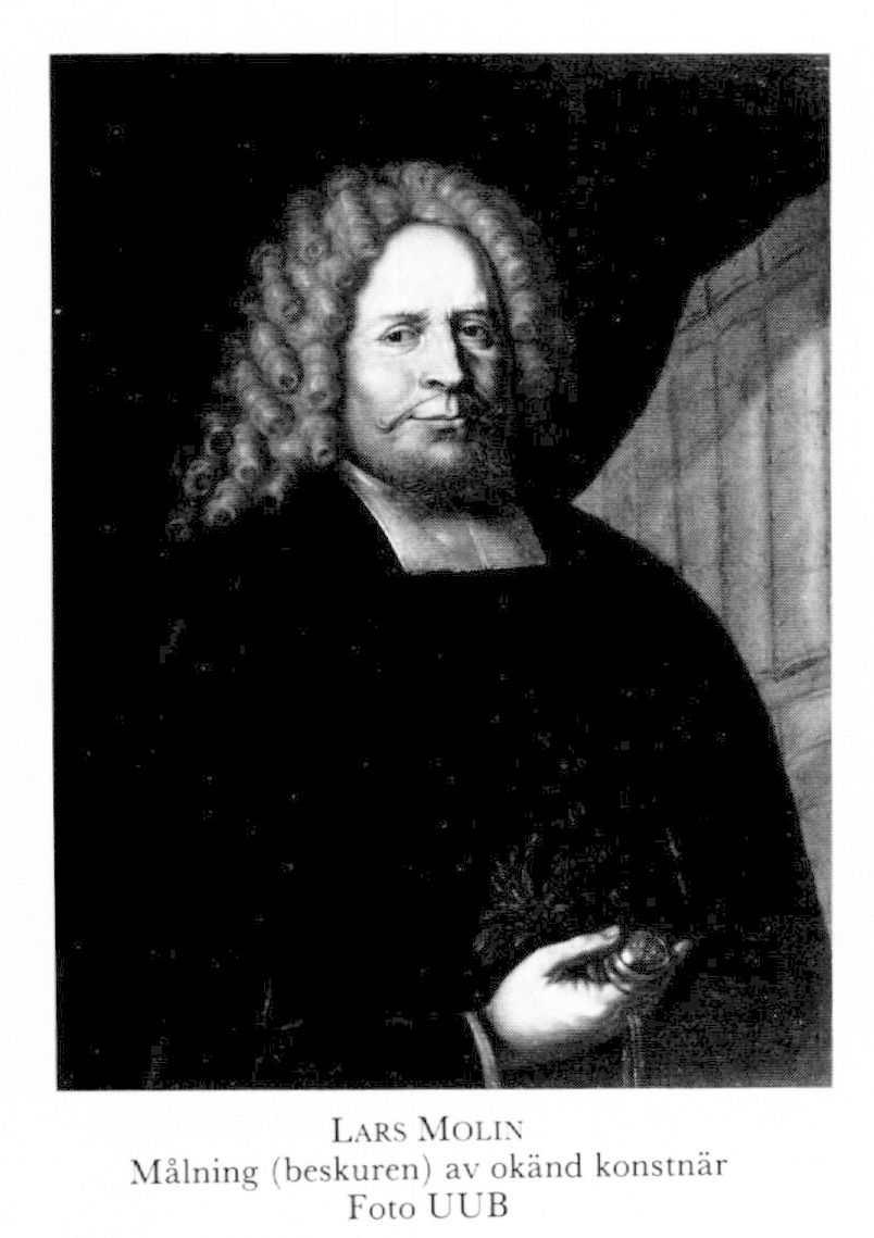 Molin, Lars, dp 4 dec 1657 i Kumla, Vm, d 19 sept 1723 i Uppsala, Domk. Föräldrar: kaplanen Jonas Molinus o Anna Kumblæa. Skolgång i Västerås, inskr vid UU 15 febr 77, konrektor i Västerås 85, konsistorienotarie där 86, bibliotekarie hos UU:s kansler Magnus Gabriel De la Gardie 86, mag vid UU 11 dec 88, studieresa till Danmark, Tyskland, Italien, Holland o England 89–93, TL vid univ i Giessen 24 juni 92, prästv i Sthlm 22 aug 93, eo reg:pastor vid livgardet 1 febr 94, ord reg:pastor där maj 94, teol prof i Dorpat 20 okt 94, kh i Nüggens förs där 94, teol prof i Pernau sept 99, överhovpredikant hos änkedrottn Hedvig Eleonora 9 jan 02, TD vid univ i Giessen 31 mars 03, förste teol prof vid UU o domprost i Uppsala 27 febr 05, rektor vid UU ht 05, ht 14 o vt 23, deltog i riksdagarna 10, 13/14, 19, 20 o 23.