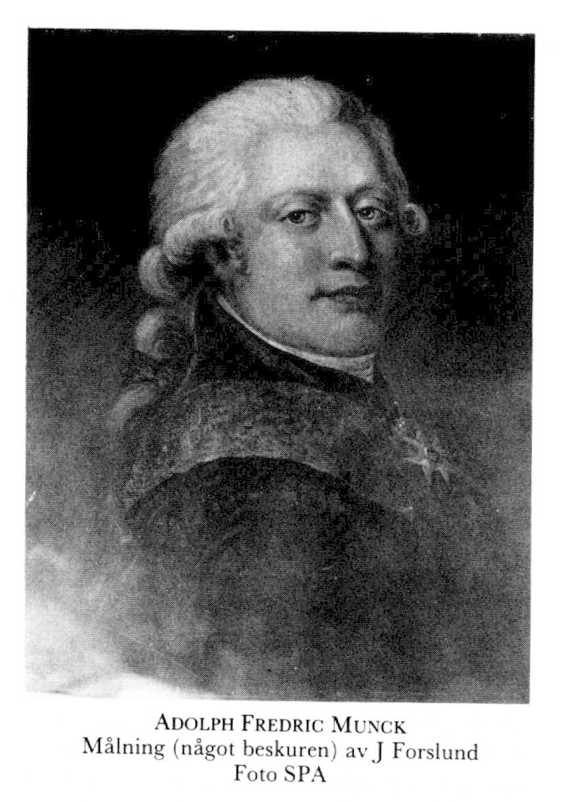 1 Munck, Adolph Fredric, f 29 april 1749 i S:t Michel, Finland, d 18 juli 1831 i Massa-Carrara, Italien. Föräldrar: överstelöjtn Anders Erik M o Hedvig Juliana Wright. Volontär vid Savolax infanterireg 22 juli 60, page vid hovet 16 april 65, kammarpage hos konung Adolf Fredrik 12 juli 67, kornett vid livdragonreg 13 nov 71, förste kammarpage hos Gustav III 6 juni 72, hovstallmästare 30 dec 72, löjtn vid livdragonreg 14 febr 75, ryttmästare vid adelsfanereg 22 maj 75, sekundmajor där 22 okt 76, förste hovstallmästare 3 okt 73-88, deltog i riksdagarna 78, 86 o 89, ceremonimästare vid alla K M:ts ordnar 27 dec 78, ståth på Drottningholms slott 24 jan 81, senare även vid Svartsjö slott o Ventholmens kungsgård, överstelöjtn i survivance vid adelsfanereg 20 april 82, ståth över Drottningholms o Svartsjö slott o län 86–4 okt 90, led av utredn:kommissionen för krigsrustningarna 23 maj 88, landsh i Uppsala län 27 maj 88 (tilltr ej), frih mellan 27 maj o 20 juni 88 (frih:brev antedaterat till 27 dec 78; Odhner 3, s 69 f; Nordin), president i kammarrevisionen 3 juli 88–92, greve 4 juli 88, förordn att vårda o förvalta Ulriksdals o Karlbergs slott o kungsgårdar 11 febr 89, tf överståth 11 febr–4 maj 89, led av regeringen under konungens vistelse i Finland maj 89, ordf i hemliga krigsberedn 10 maj 89, ordf i komm ang örlogsflottans förbättrande 14 nov 89, erhöll av K M:t "ett års tjänstledighet ifrån början av nästkommande år till att i enskilda angelägenheter företaga en utrikes resa" 4 okt 90, avsked från samtl ämbeten senast 7 juli 92, bosatt i Italien, natural greve i Parma o Piacenza 16. – Serafimerriddare med rätt att bära ordens insignier i briljanter 22 nov 90. – Ogift.