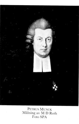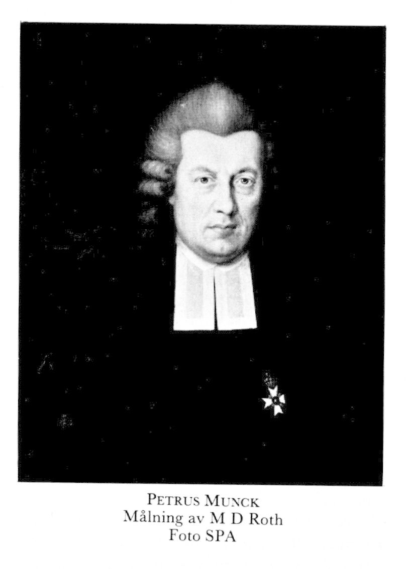 1 Munck, Petrus, f 3 juli 1732 i (Trolle-) Ljungby, Krist, d 18 (19 enl db för Lund) juli 1803 i Ramlösa vid Helsingborg (Sundius). Föräldrar: kh Zacharias M o Catharina Sophia Winding. Inskr vid LU 19 okt 45, ex theologicum 5 dec 47, ex stili 48, respondent på en avh under S Munthe 21 okt 49, disp pro gradu 20 mars 51, mag 4 juli 51, doc i österländska språk 6 mars 53, allt vid LU, inskr vid UU 25 april 54, teol adjunkt vid LU 21 juni 57–69, prästv i Lund 17 dec 57, kh i prebendeförs:arna Hällestad, Dalby o Bonderup, alla i Malm, 1 maj 65 (enl k brev 11 jan 64 o kanslersbrev 30 nov 64)–30 april 72, prost där, disp för teol drsgrad vid LU 14 juni 69, TD 23 juni 69, prof i grekiska o österländska språken 28 nov 69, tredje teol prof 22 maj 75, andre teol prof okt 76, allt vid LU, förste teol prof där o domprost i Lund 18 mars 78, rektor vid LU 80 (vald 22 nov 79), riksbanksrevisor 91 o 01, deltog i riksdagarna 92 o 00, biskop i Lund o prokansler vid LU från 19 juni 94, biskopsvigd i Uppsala 7 sept 94, revisor vid riksgäldskontoret 99 o 01. – Led av Teol-homiletiska sällsk i Uppsala 83, av Samf Pro fide et Christianismo 91.