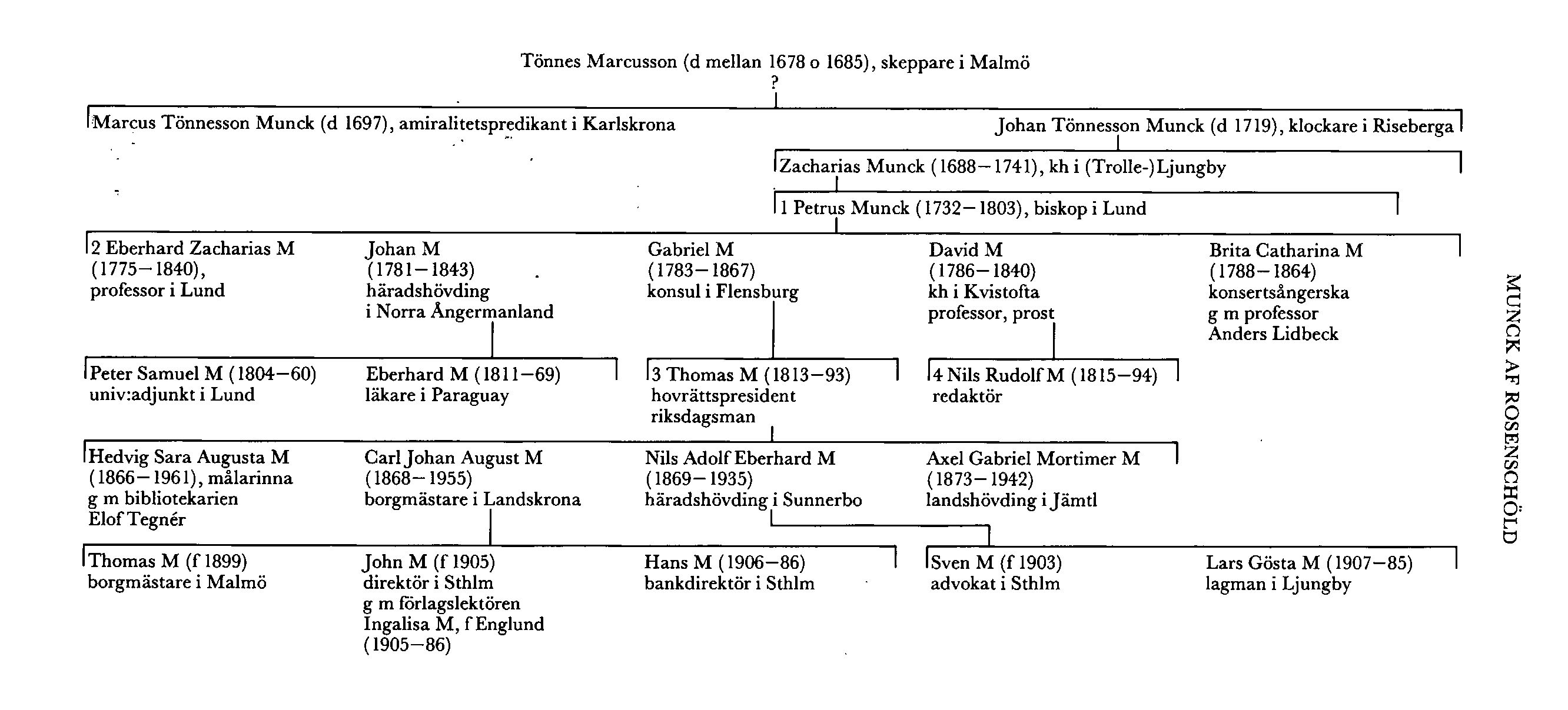 Klockarens son kh magister Zacharias Munck (1688–1741) i Ljungby (nu Trolle-Ljungby), Krist, var far till biskop Petrus Munck (M 1). Den sistnämndes elva barn i hans äktenskap med en dotter till professor Eberhard Rosenblad adlades 1799 med namnet M. Bland döttrarna var konsertsångerskan Brita Catharina Lidbeck, f M (1788–1864), som blev LMA 1827. Hon hade 1807 gift sig med professor Anders Lidbeck (bd 22) och var mor till novellförfattarinnan Clara Sandströmer, f Lidbeck, gift med statsrådet Anders Peter Sandströmer. Av Brita Catharinas systrar var en gift med amiralitetssuperintendenten Anders Lars Fahnehjelm (bd 15, s 73) och en med professor Carl Fredrik Liljevalch (bd 23). Deras äldste bror var professor Eberhard Zacharias M (M 2). En annan bror var Johan M (1781–1843), som i Lund blev magister 1799 och eo juris adjunkt 1801 samt var ordinarie sådan 1807–19. Han fick häradshövdings n h o v 1812, var häradshövding i Norra Ångermanlands domsaga från 1819 till sin död och fick lagmans n h o v 1830. Tegnér ansåg hans befordran bero på att han var systerson till statssekreteraren, sedermera justitiestatsministern Mathias Rosenblad.