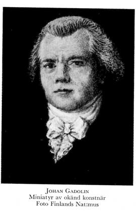 2 Gadolin, Johan, son till G 1, f 5 juni 1760 i Åbo, d 15 aug 1852 på Sunila säteri, Virmo (Åbo o Björneb). Inskr vid Åbo akad 10 april 1775, vid Uppsala univ 25 juni 1779, mag där 17 juni 1782, amanuens vid akad:bibl i Åbo 20 febr 1784, eo adjunkt 2 juli 1785, eo prof 8 aug s å, ord adjunkt 3 jan 1789, prof i kemi i survivance efter P A Gadd 6 maj s å, säte o stämma i fil fak 13 d...