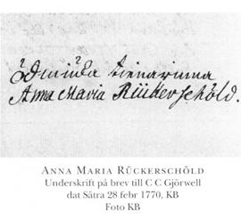 Rückerschöld, Anna Maria, före 1751 Rücker, i 5 febr 1725 i Hedemora, d 25 maj 1805 i Sthlm, Jak o Joh. Föräldrar: hovrättsrådet Reinhold R o Emerentia Polhem. Kokboksförf.