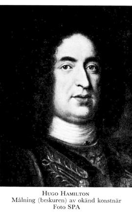 1 Hamilton, Hugo, f 20 maj 1655 på Monea Castle, Irland, d 19 jan 1724 i Sthlm (enl db för Lommaryd, Jönk). Föräldrar: kaptenen John H o Janet Somerville. Kornett vid engelskt reg 78, fänrik vid Älvsborgs reg 30 juli 81, kapten där 20 okt 85, vid livreg till fot 18 mars 86, frih (H af Hageby) 12 april 89 (introd 93), major vid Västgöta-Dals reg 14 jan 98, överstelöjtn vid Älvsborgs reg 26 fe...