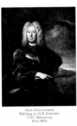 1 Gyllenkrok, Axel, f trol 2 aug 1664 i Åbo, d 17 sept 1730 på Svenstorp, Odarslöv (enl kyrkobok för Igelösa, Malm). Föräldrar: assessor Anders Krok, adl Gyllenkrok, o Maria Mums. Inskr vid Åbo akad 77, förare vid livgardet 28 febr 85, sergeant 24 april 85, fältväbel 88, fänrik 13 nov 88, i uti krigstjänst 91–95, löjtn i livgardet 22 aug 93, kapten där 22 juni 96, generalkvartermäs...