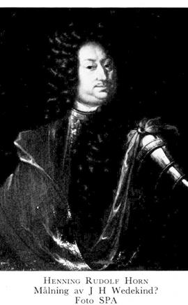 1 Horn, Henning Rudolf, f 1651 i Pommern, d 9 maj 1730 i Sthlm. Föräldrar: Baltzar H o Sophia v Raden. Volontär vid artilleriet 64, vid överste Krusdorffs kavallerireg 66, pikenerare vid överste Dietrich v Harens värvade infanterireg 67, fänrik där 71, löjtn där 73, reg kvartermästare där 75, kapten där 76, major vid överste Axel Wachtmeisters kavalleriskvadroner 77, överstelöjtn vid Bleking...