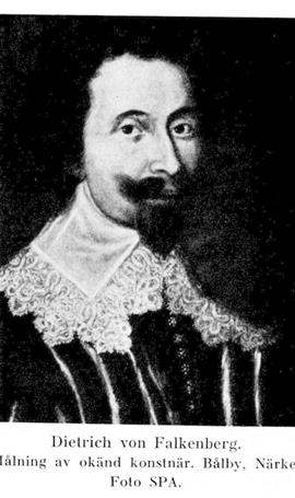 Dietrich von Falkenberg, f. vid 1580-talets slut på Herstelle i Hessen, d. 10 maj (g. st.; 20 enl. n. st.) 1631 i Magdeburg. Föräldrar: fogden Christoff von Falkenberg och Appollonia Spiegel zum Desenberg. Hovjunkare hos lantgreve Moritz av Hessen i Kassel; ledsagade dennes son arvprins Otto på hans resa 1611 till Nederländerna och England; sänd av lantgreven i beskickning till Sverige höste...