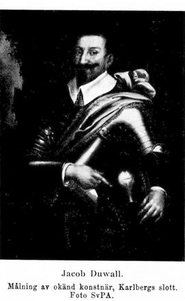 1. Jacob Duwall (postum) friherre Duwall, f. omkr. 1589 i Prenzlau i Altmark, d. 9 maj 1634 trol. i Breslau. Föräldrar: fogden Albrecht Mack Duwall och Elsa von Bredow. Musketerare i svensk tjänst omkr. 1607; kapten vid fältherrens (J. De la Gardie) reg. 17 jan. 1614, vid greve Philip von Mansfelds reg. 1621; överstelöjtnant vid S. Cobrons reg. 15 juli s. å. och vid Henrik Flemings karelska ...