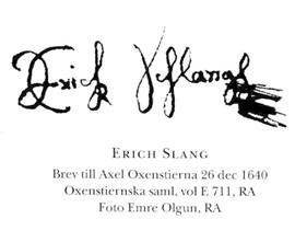 Slang (Schlangh), Erich, f i början av 1600-talet, trol i Finland, d 23 okt 1642 vid Leipzig. Föräldrar: underståthållaren Claus Schlangh o Elin Johansdtr Boose. Kornett vid Hans Wachtmeisters kompani 30, överstelöjtn o chef för eget reg finska ryttare 35, nämns som överste mars 37, generalmajor av kavalleriet 41.