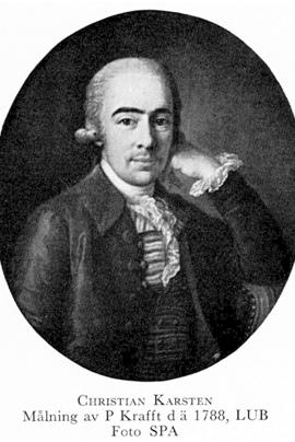 Karsten, Christopher Christian, f 9 sept 1756 i Ystad, d 7 aug 1827 i Lovö, Sth. Föräldrar: bagaråldermannen Christopher Christian K o Elna Catharina Rot. Studier vid trivialskolan i Ystad, körsångare vid K teatern 73—76, debuterade där 76, sångstudier i Khvn, förste aktör o sångare vid K teatern 76—1 okt 07, förste hovsångare (tenor) 78, vistades i Khvn 83—84, i Berlin 88, ...