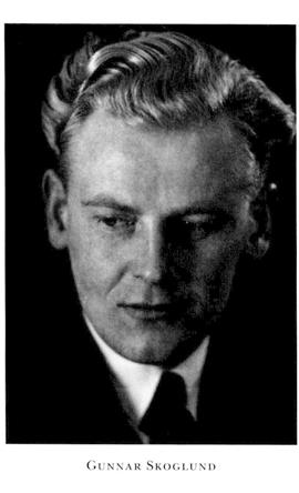 Skoglund, Gunnar, f 2 sept 1899 i Sthlm, Ad Fredr, d 21 sept 1983 i Torö, Sth. Föräldrar: handelsbokhållaren Aron Fredrik S o Elin Maria Lindgren. Studentex vid H reallärov å Norrmalm i Sthlm 10 maj 19, inskr vid StH ht 19, litt:vetensk studier där 19-21, medarb i Idrottsbladet 19–24, assistent o sekr vid Konserthusteatern 24–26, sekr hos Ernst Rolf (bd 30) 26–27, anställd vid Radio...